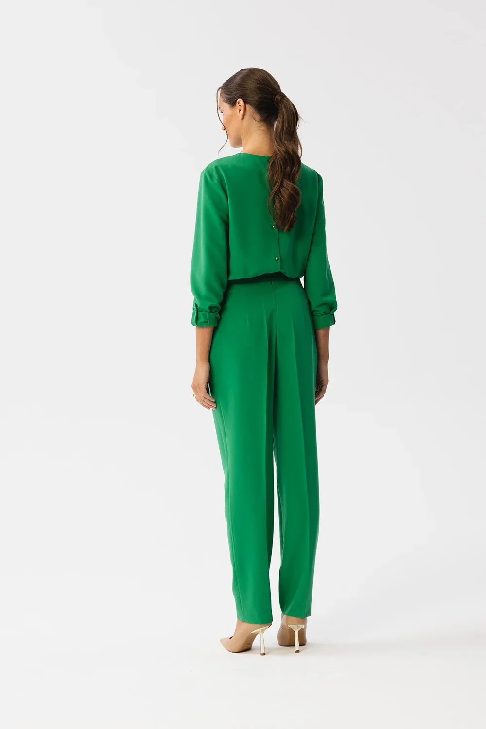 Představujeme jedinečný jednodílný overal, který kombinuje styl a pohodlí. Výstřih kombinézy zdobí nápadný rozparek, který jí dodává jemnost. Řasení v pase zvýrazňuje siluetu a dodává obleku eleganci. Na zádech je zapínání na knoflíky a krytý zip, který vede od pasu dolů. Dlouhé rukávy s manžetami a zapínáním, které umožňuje upravit délku, dodávají obleku jedinečný nádech. Nohavice jsou dlouhé a na spodním okraji stažené, což obleku dodává elegantní nádech. Boční kapsy jsou praktické i stylové. Kombinéza nemá podšívku, takže je lehká a pohodlná na nošení. Je ideální volbou pro mnoho příležitostí, od formálních setkání až po uvolněnější akce, a umožní vám vyniknout a cítit se výjimečně.