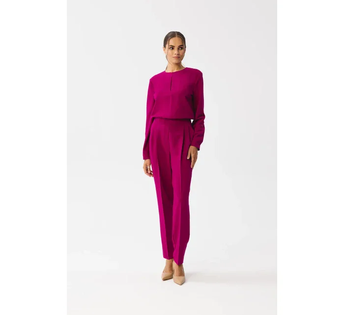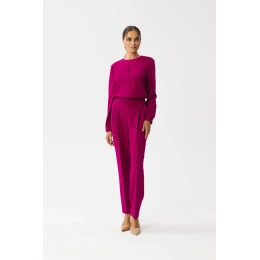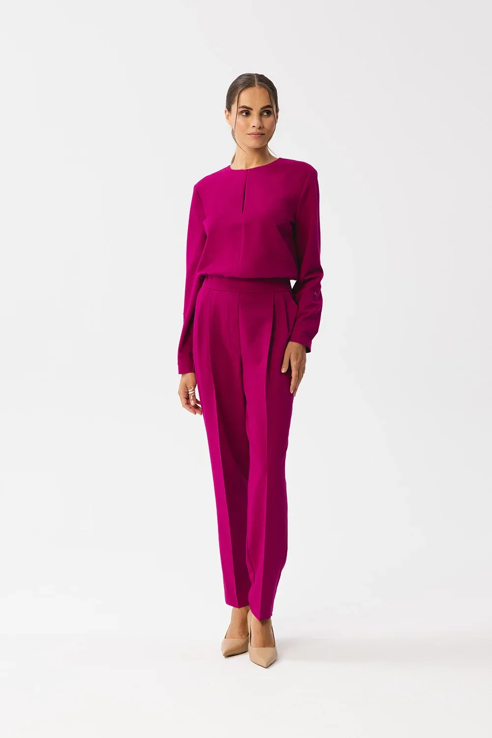Představujeme jedinečný jednodílný overal, který kombinuje styl a pohodlí. Výstřih kombinézy zdobí nápadný rozparek, který jí dodává jemnost. Řasení v pase zvýrazňuje siluetu a dodává obleku eleganci. Na zádech je zapínání na knoflíky a krytý zip, který vede od pasu dolů. Dlouhé rukávy s manžetami a zapínáním, které umožňuje upravit délku, dodávají obleku jedinečný nádech. Nohavice jsou dlouhé a na spodním okraji stažené, což obleku dodává elegantní nádech. Boční kapsy jsou praktické i stylové. Kombinéza nemá podšívku, takže je lehká a pohodlná na nošení. Je ideální volbou pro mnoho příležitostí, od formálních setkání až po uvolněnější akce, a umožní vám vyniknout a cítit se výjimečně.