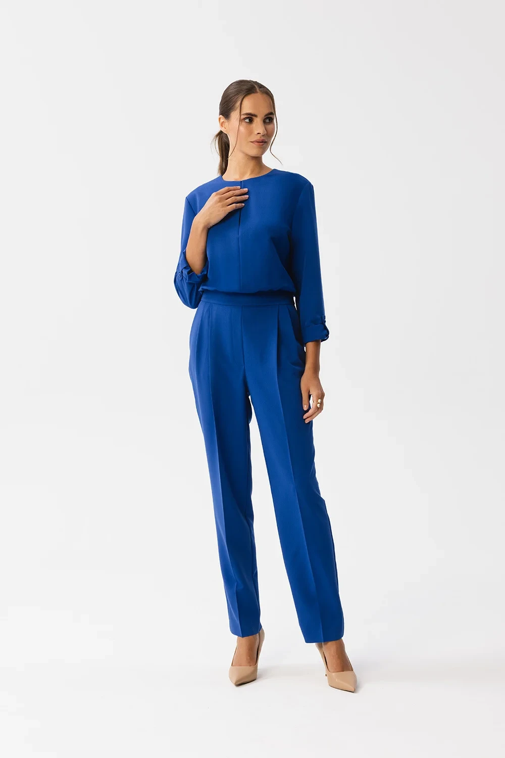Představujeme jedinečný jednodílný overal, který kombinuje styl a pohodlí. Výstřih kombinézy zdobí nápadný rozparek, který jí dodává jemnost. Řasení v pase zvýrazňuje siluetu a dodává obleku eleganci. Na zádech je zapínání na knoflíky a krytý zip, který vede od pasu dolů. Dlouhé rukávy s manžetami a zapínáním, které umožňuje upravit délku, dodávají obleku jedinečný nádech. Nohavice jsou dlouhé a na spodním okraji stažené, což obleku dodává elegantní nádech. Boční kapsy jsou praktické i stylové. Kombinéza nemá podšívku, takže je lehká a pohodlná na nošení. Je ideální volbou pro mnoho příležitostí, od formálních setkání až po uvolněnější akce, a umožní vám vyniknout a cítit se výjimečně.