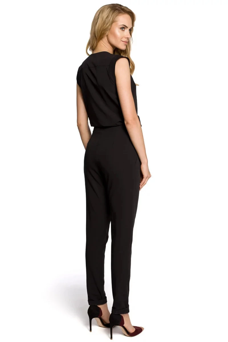 Zavinovací overal bez rukávů a s bočními kapsami. Úzké nohavice s ohrnutým lemem. Skrytý, boční zip.
