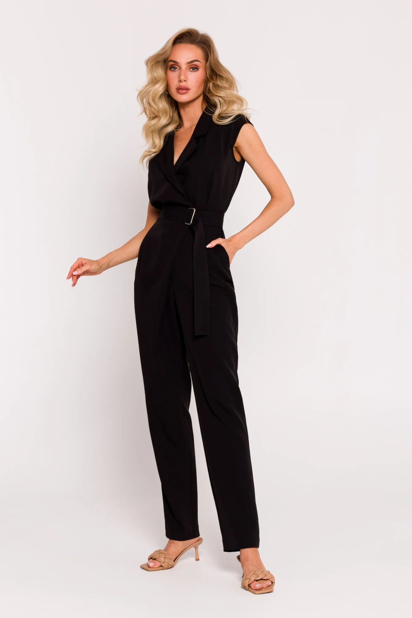 Představujeme jedinečný látkový overal, jehož design a zpracování odrážejí nejvyšší standardy polského krejčovství. Tento jednodílný oblek je kombinací modernosti, pohodlí a jedinečného stylu, který vyzařuje z polského krejčovského řemesla. Nohavice obleku, zužující se směrem dolů, upoutají pozornost ozdobnou asymetrií na boku, která celku dodává jemnou extravaganci. Vrchní část obleku tvoří obálková halenka bez rukávů s elegantním límcem a výstřihem do V. Jedná se o kombinaci klasiky a moderny, která vytváří nápadný a stylový vzhled. Pas v přední části kombinézy je opatřen miniaturním zapínáním na patentky a krytým zipem, díky čemuž je oděv nejen elegantní, ale také se snadno obléká a svléká. Zadní část pasu je elastická, což zajišťuje, že se kombinéza dokonale přizpůsobí postavě a zároveň zůstane pohodlná. Praktickým prvkem jsou boční kapsy, které dodávají obleku na užitečnosti. Součástí je navíc pásek se sponou, který zvýrazňuje pas a dodává stylizaci větší šmrnc. Tento oblek není pouhým oděvem, je výrazem polské preciznosti a kreativity v oblasti módy. Návrh a výroba v Polsku jsou zárukou vysoké kvality zpracování a důrazu na detail, díky čemuž je nošení tohoto obleku nejen pohodlné, ale i příjemné na pohled.
