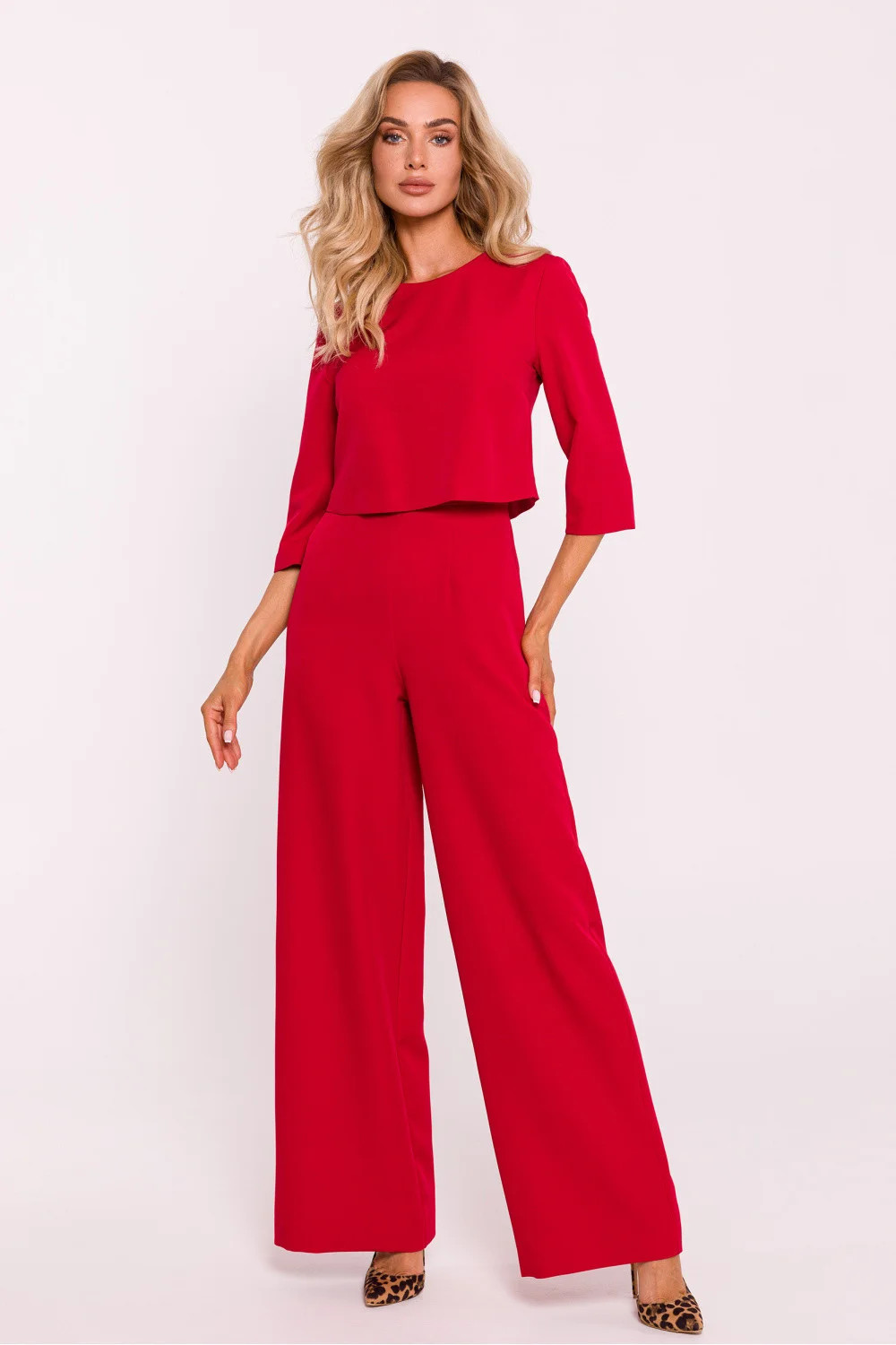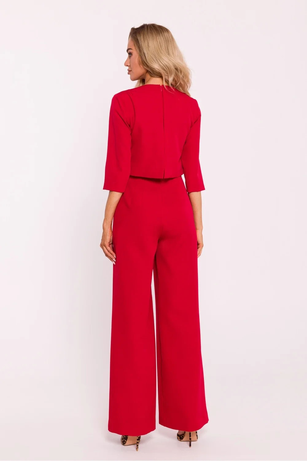 Elegantní dámský kombinéza vyrobený z vysoce kvalitní látky. Vyznačuje se širokými nohavicemi, které mu dodávají módní, uvolněný vzhled. Horní část kombinézy je dvojitá, co mu dodává strukturu a eleganci, a krátké rukávy zajišťují pohodlí v teplejších dnech. Na zadní straně je krytý zip, který usnadňuje oblékání a svlékání. Vložené boční kapsy přidávají praktičnost a funkčnost. Navržený a ušitý v Polsku spojuje moderní styl s vynikajícím řemeslem.