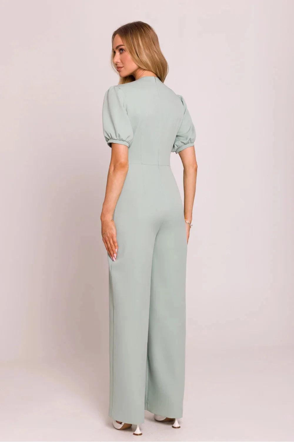 Elegatní overal s ženským střihem vyrobený z vysoce kvalitní látky. Hluboký výstřih ve tvaru písmene V krásně zdůrazňuje krk a dekolt, zatímco zdůrazněný pas podtrhuje siluetu. Krátké nafouklé rukávy s manžetami přidávají romantický akcent a lehce rozšířené nohavice s odklopenými lemy od pasu zajistí elegantní a volný vzhled. Model se zapínáním na skrytý zip vzadu, s horní částí na podšívce pro větší pohodlí nošení. Celý kousek navržen a ušit v Polsku s důrazem na každý detail.