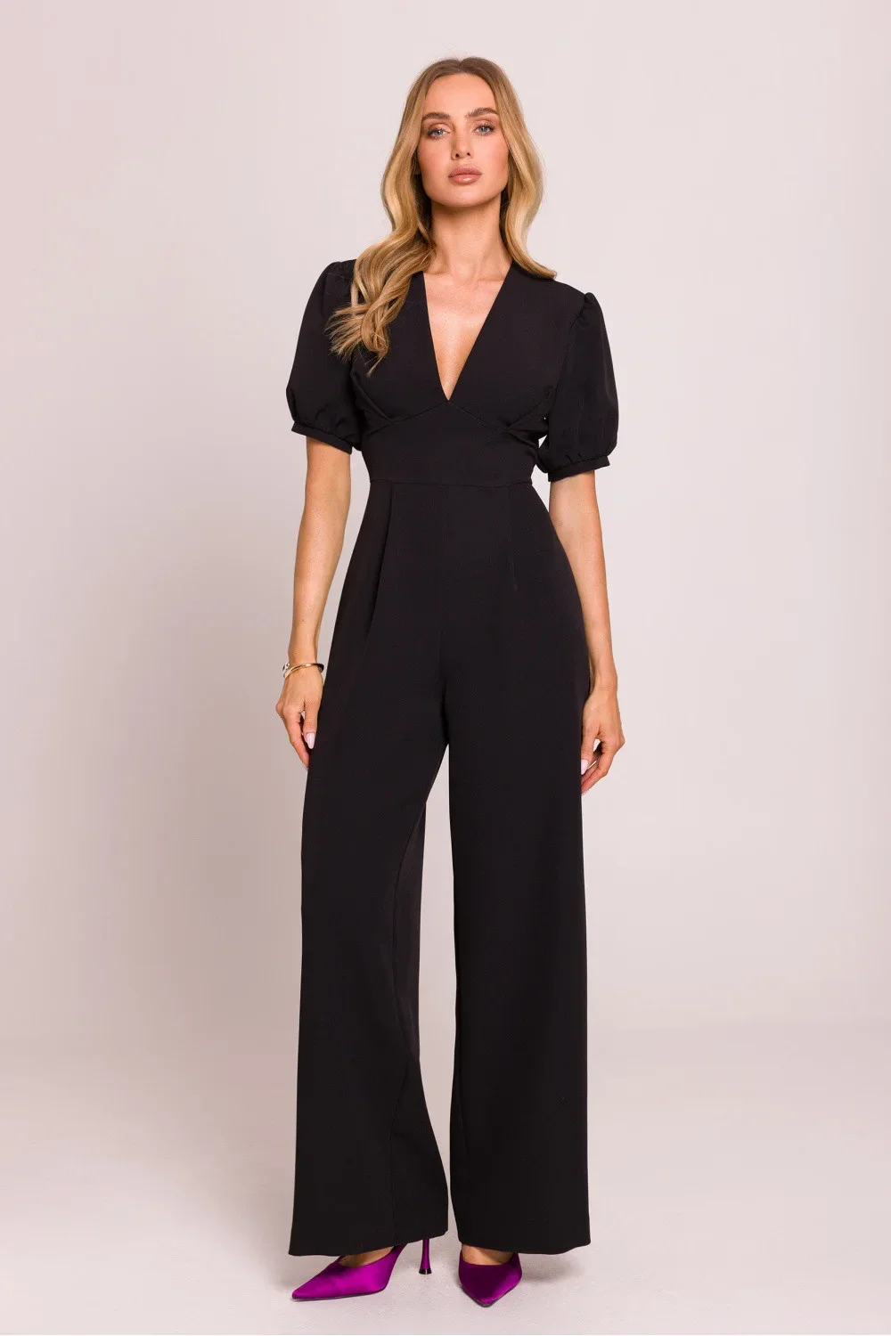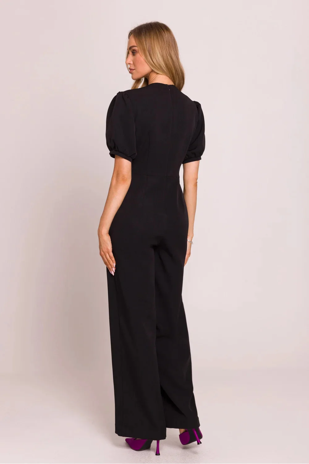 Elegantní kombinéza s ženským střihem, vyrobená z vysoce kvalitní látky. Hluboký výstřih ve tvaru písmene V krásně zdůrazňuje krk a dekolt, zatímco zdůrazněný pas podtrhuje postavu. Krátké nafouklé rukávy s manžetami přidávají romantický akcent, zatímco lehce rozšířené nohavice s kapsami od pasu zajišťují elegantní a volný vzhled. Model se zapíná na skrytý zip na zádech, s horní částí na podšívce pro větší pohodlí nošení. Celý kousek je navržen a ušit v Polsku s důrazem na každý detail.