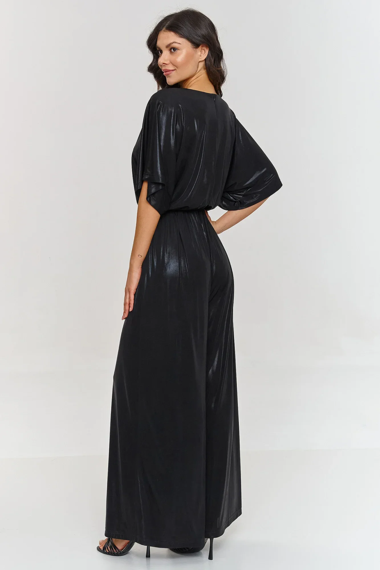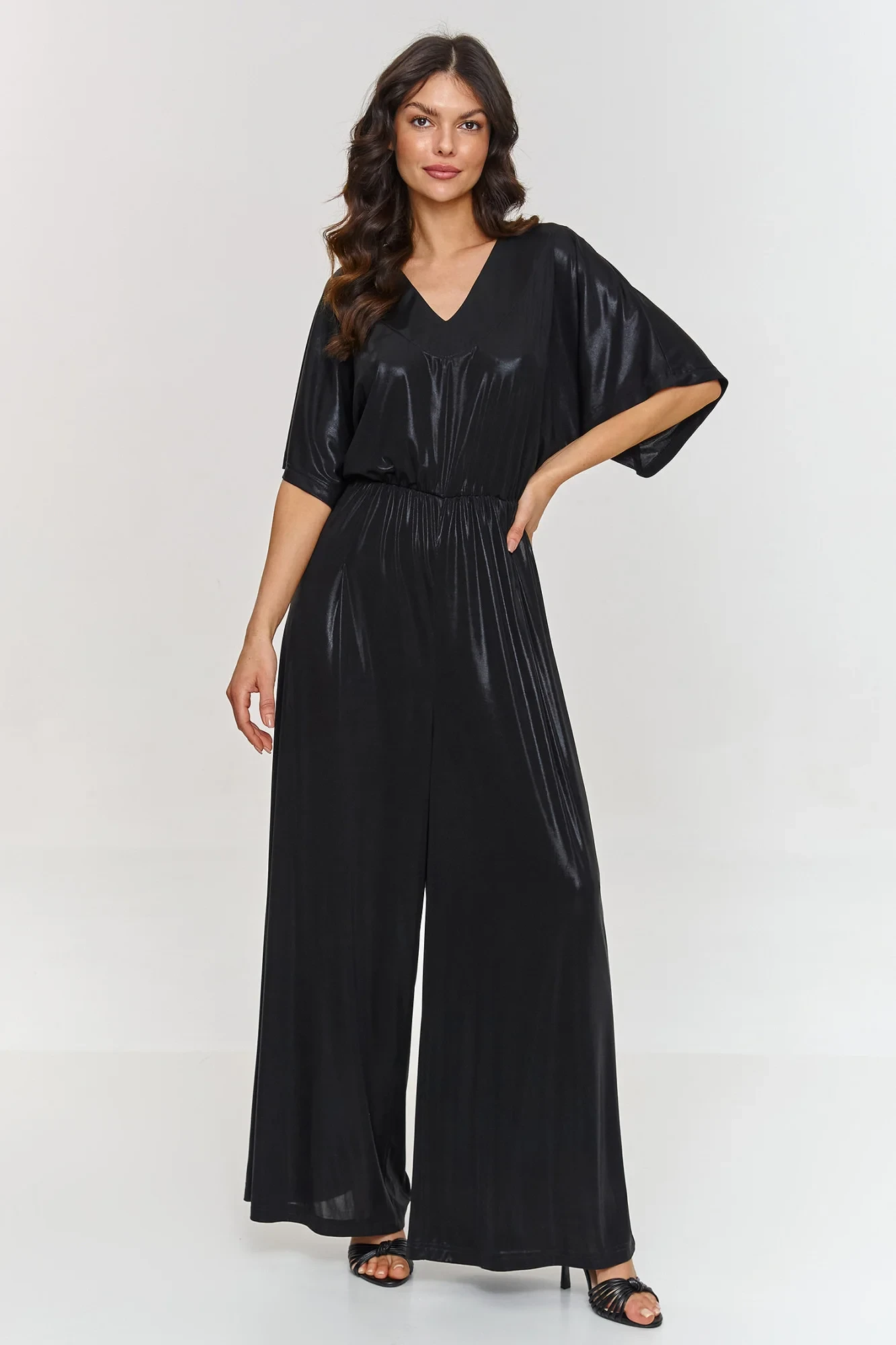 Tento overal je kombinací elegance a pohodlí, která jistě přitáhne pozornost na každé speciální události. Volný vrch s kimono rukávy dodává lehkost a volnost. Tento detail dělá outfit vypadat výjimečně a stylově, zároveň neomezuje pohyb. Výstřih do "V" je decentní a elegantní, skvěle zdůrazňuje krk a ramena. Tento střih výstřihu přidává smyslnost a zdůrazňuje ženskou siluetu, zachovává přitom klasický a elegantní vzhled. Široké nohavice dodávají overalu lehkost a zároveň zakrývají nedokonalosti postavy a umožní prodloužit siluetu. Elastický pas v pasu zaručuje přizpůsobení a zdůraznění postavy, vytváří efekt přesýpacích hodin. Díky tomu se overal nejen stylově, ale i pohodlně prezentuje po celý den či večer. Model je vyroben z jemného materiálu s metalickým povrchem, který outfitu dodává výjimečný lesk a moderní charakter. Overal v metalické barvě s výstřihem do "V" je návrh, který vás vynese z davu. Jeho moderní střih a lesklý materiál vám zajistí sebedůvěru a styl na každé party. Je to skvělá alternativa k šatům, zaručující pohodlí a výjimečný vzhled.
