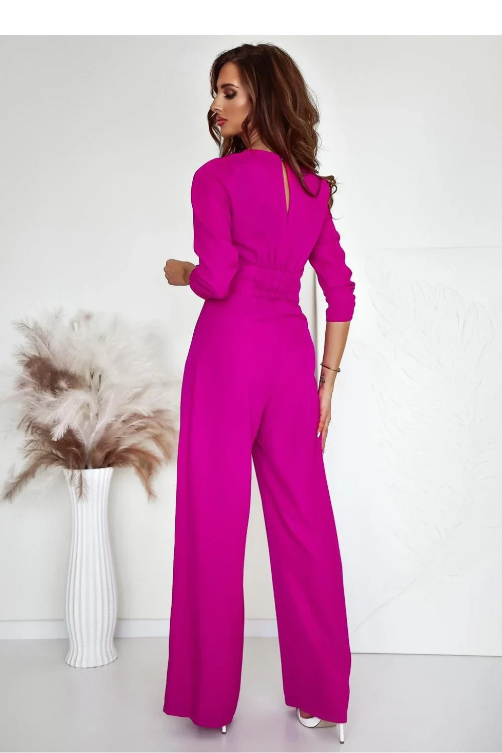 Elegantní a pohodlný kombinéza s elegantním střihem, ideální na různé příležitosti. Vyroben z lehkého, příjemného na dotek materiálu, poskytujícího pohodlí při nošení. Má srdcovitý výstřih, který jemně zdůrazňuje linii krku a dodává ženskost. Na pasu a na rukávech jsou umístěny elastické gumičky, díky nimž se kombinéza skvěle přizpůsobuje postavě. Vložené kapsy po stranách přidávají funkčnost a zakrytý zip zaručuje estetické dokončení. Ozdobný řetízek v pase představuje stylový doplněk, zdůrazňující pas a dodávající celku výjimečný charakter. Ideální volba pro každodenní stylizace, schůzky nebo večerní výlety.