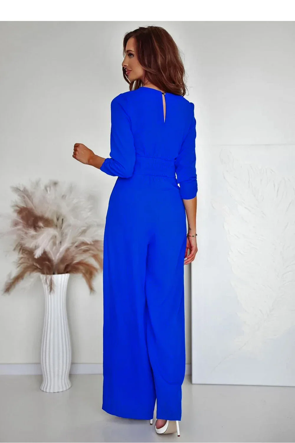 Elegantní a pohodlný overal s elegantním střihem, ideální na různé příležitosti. Vyrobený z lehkého, příjemného na dotek materiálu, poskytujícího pohodlí při nošení. Má výstřih do šířky srdce, který jemně zdůrazňuje linii krku a dodává ženskost. V pasu a na rukávech je umístěná elastická guma, díky čemuž se overal skvěle přizpůsobuje postavě. Vložené kapsy na bocích přidávají funkčnost a zakrytý zip zaručuje estetické provedení. Ozdobný řetízek v pase je stylovým akcentem, zdůrazňujícím pas a dodávajícím celku výjimečný charakter. Ideální volba pro každodenní stylizace, setkání nebo večerní vycházky.