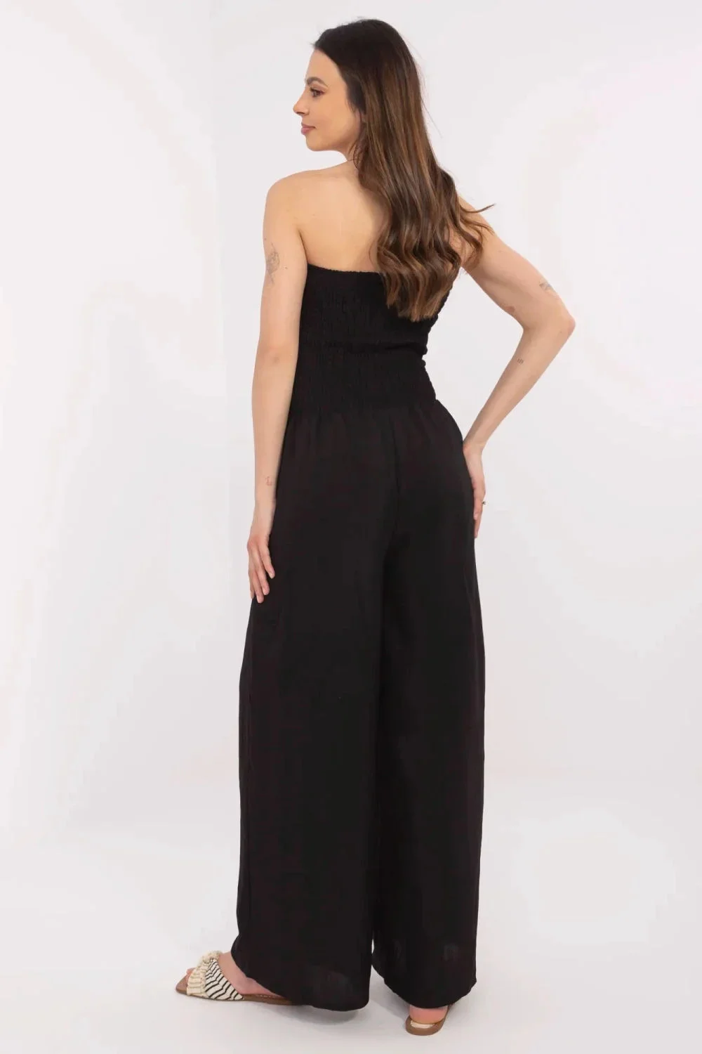Stylový a pohodlný overal ideální na každodenní nošení. Ušitý z prodyšné a měkké viskózy, zaručuje pohodlí po celý den. Dlouhá, volná forma se širokými nohavicemi a španělským výstřihem vytváří moderní, uvolněný vzhled. Hladký materiál zdůrazňuje minimalistický charakter modelu, a nařasení v horní části mu dodává jemnou lehkost. Absence zapínání usnadňuje rychlé oblékání, a boční, zasouvací kapsy zvyšují funkčnost. Ideální volba pro ženy oceňující styl a pohodlí v jednom.