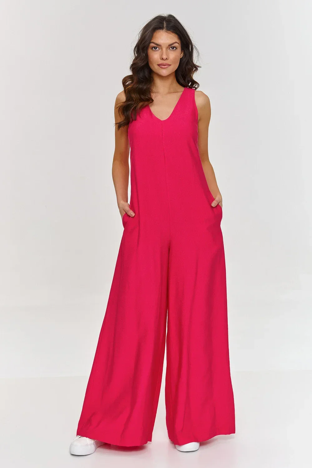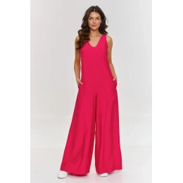 Elegantní overal je skvělým návrhem pro ženy hledající módní outfit. Model má decentní výstřih ve tvaru písmene V, který mu dodává elegantní a ženský vzhled a navíc zdůrazňuje postavu a opticky prodlužuje krk, přidávajíc třídu a lehkost. Široké nohavice a volný střih dělají z overalu velmi pohodlný a zároveň originální kousek. Model se zapíná na zip, co usnadňuje jeho oblékání, zatímco boční kapsy jsou praktickým doplňkem. Další jeho výhodou je příjemný na dotek a prodyšný materiál, což z něj činí vynikající volbu na teplé dny. Díky jednoduchému, ale efektnímu střihu se overal hodí jak na každodenní nošení, tak na formální události, jako jsou schůzky nebo večerní vycházky. Můžete jej kombinovat s bílými teniskami na den nebo se špičatými podpatky na elegantnější události.