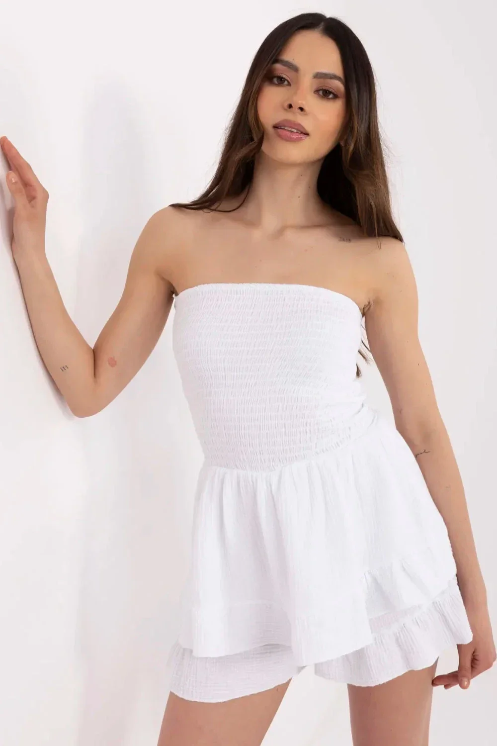 Elegantní dámský overal ideální pro každodenní outfit, kombinující pohodlí s trendy vzhledem. Vyrobený z měkké bavlny, poskytuje pohodlí po celý den. Krátké nohavice a bezrukávový střih dělají z tohoto kusu skvělou volbu na teplé dny. Overal je charakterizován jednoduchým, hladkým vzorem, který zdůrazňuje minimalistický charakter oblečení. Zdobení v horní části a volán na vrchu dodávají celku lehkost a jemnou ženskost. Bez zapínání zajišťuje pohodlné nošení a snadné oblékání.