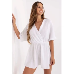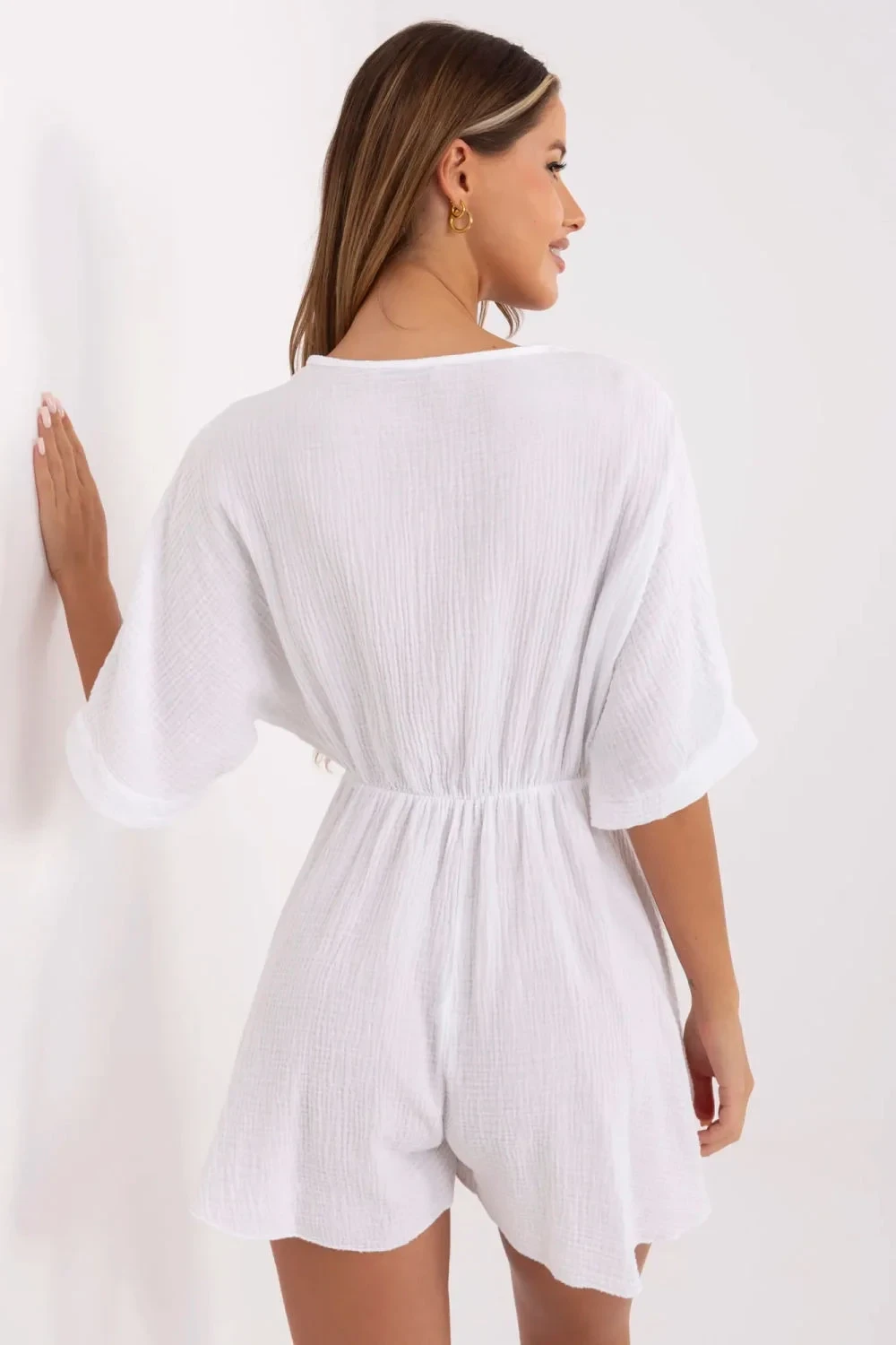 Lehký a vzdušný mušelínový overal je ideální volbou pro každodenní letní stylizace. Vyrobený z přírodní, prodyšné bavlny, zaručuje pohodlí po celý den i v horkých dnech. Model s krátkou délkou, s krátkým rukávem a záhybovým výstřihem, který jemně zdůrazňuje linii krku a dekoltu. V pase je vsazena guma, díky které se overal přizpůsobí postavě a zdůrazní její proporce. Bez zapínání je nasazování rychlé a pohodlné. Hladká struktura látky a jednoduchý střih z něj dělají univerzální kousek šatníku, skvěle se hodí jak na procházku, nákupy, tak i letní setkání s přáteli.