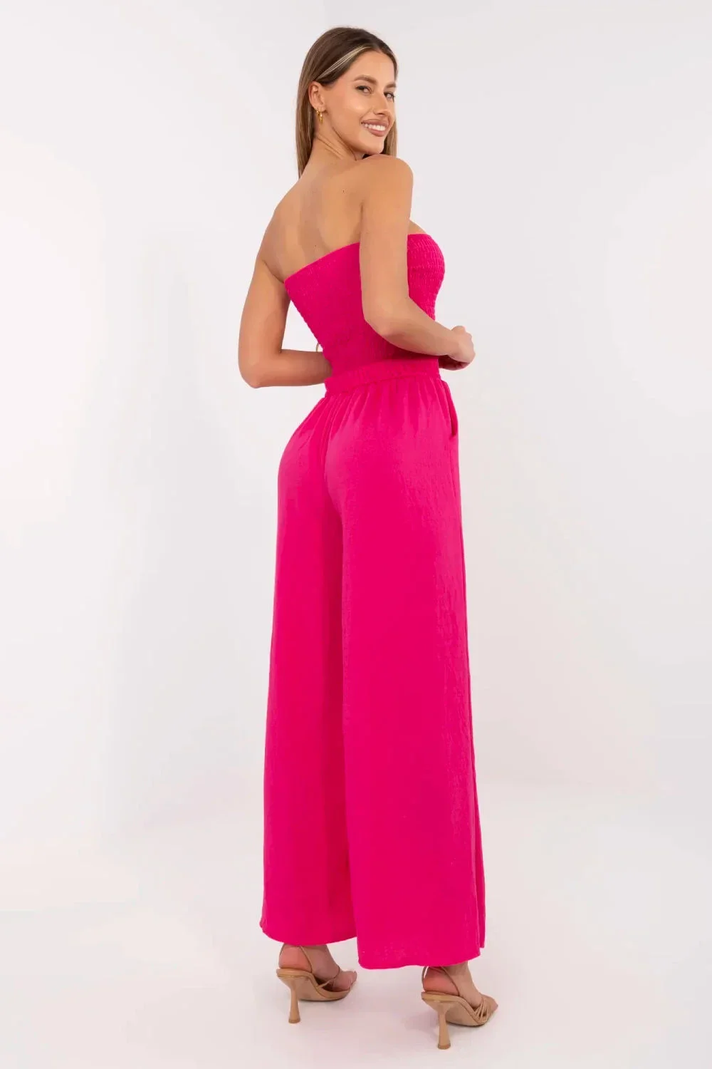 Elegantní a pohodlný overal ideální na každodenní vycházky. Vyrobený z prodyšné a měkké viskózy, zaručuje pohodlí po celý den. Dlouhý, volný střih s širokými nohavicemi a španělským výstřihem vytváří moderní, volný vzhled. Hladký materiál zdůrazňuje minimalistický charakter modelu a záhyby v horní části mu dodávají jemnou lehkost. Bez zapínání usnadňuje rychlé oblékání a boční, vložené kapsy zvyšují funkčnost. Ideální volba pro ženy, které oceňují styl a pohodlí v jednom.