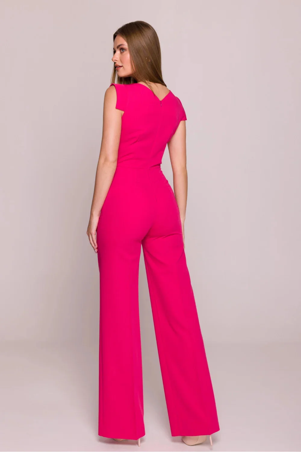 Moderní overal vyrobený z hladké, lehce elastické látky s saténovým povrchem, který mu dodává jemný lesk a eleganci. Bez rukávů s asymetrickým výstřihem zdobeným efektní záložkou, která přitahuje pozornost a zdůrazňuje jedinečný charakter oblečení. Zapínání na skrytý zip vzadu zaručuje pohodlí a udržuje čistý vzhled. Horní část overalu je přizpůsobená, s vysokým pasem, což zdůrazňuje pas a dodává siluetě ženské tvary. Široké nohavice s přehnutým lemem přidávají styl a zajišťují pohodlí nošení. Boční kapsy jsou praktickým doplňkem a absence podšívky zajišťuje, že overal je lehký a prodyšný. Navrženo a ušito v Polsku.