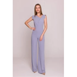 Moderní kombinéza vyrobená z hladké, lehce elastické látky s saténovým zpracováním, které jí dodává decentní lesk a eleganci. Model bez rukávů s asymetrickým výstřihem zdobený efektním záhybem, který přitahuje pozornost a zdůrazňuje jedinečný charakter oblečení. Zapínání na skrytý zip vzadu zajistí pohodlí a neatraktivní vzhled. Horní část kombinézy je přizpůsobená, s vysokým pasem, což zdůrazňuje pas a dodává siluetě ženské tvary. Široké nohavice s přeloženým lemem přidávají styl a zajišťují pohodlí nošení. Boční kapsy jsou praktickým doplňkem a absenci podšívky kombinéza činí lehkou a prodyšnou. Navrženo a ušito v Polsku.