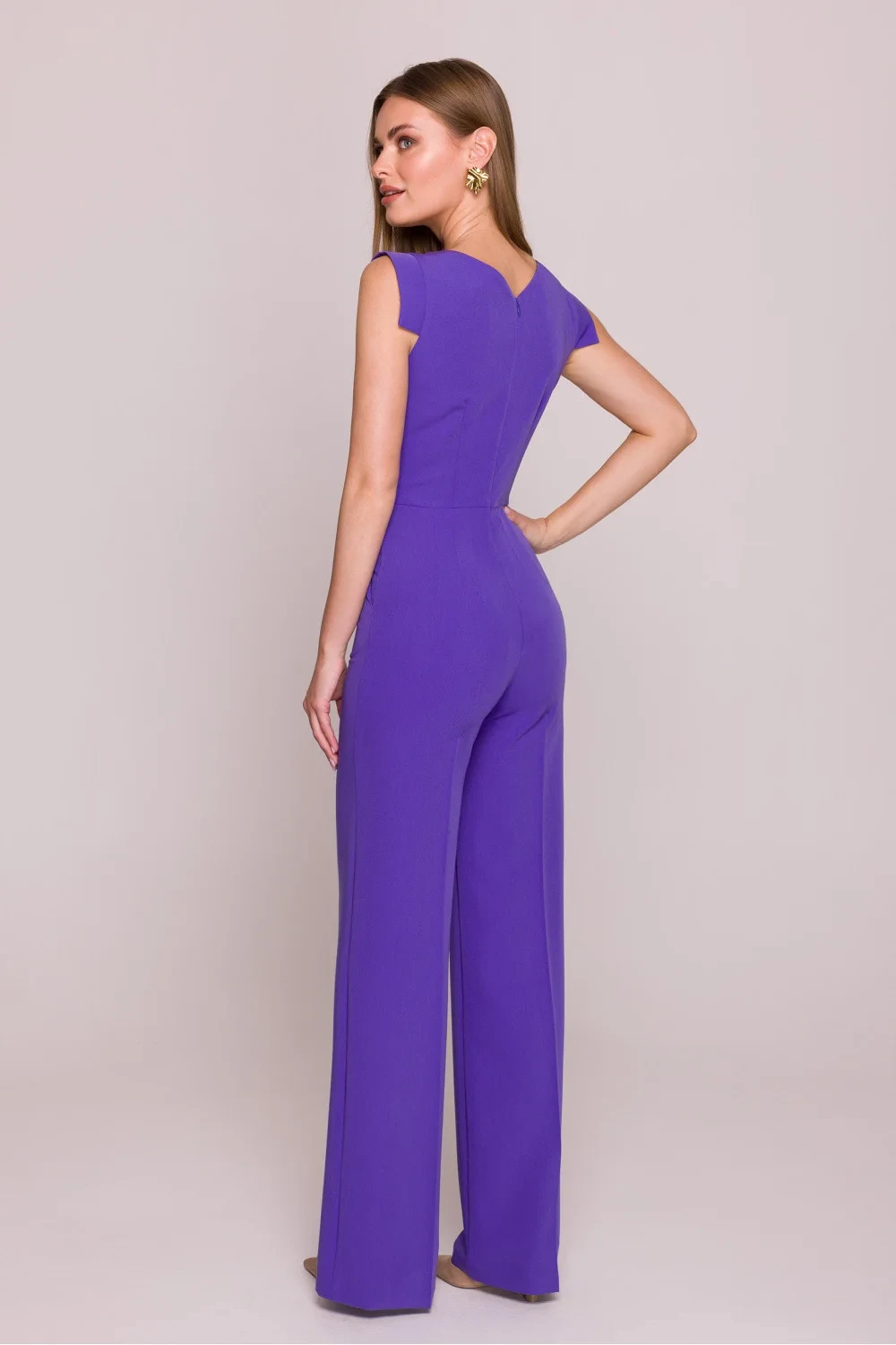 Moderní overal vyrobený z hladké, lehce elastické tkaniny s saténovým povrchem, který mu dodává jemný lesk a eleganci. Model bez rukávů s asymetrickým výstřihem zdobený efektním záhybem, který přitahuje pozornost a zdůrazňuje jedinečný charakter oblečení. Zapínání na skrytý zip zezadu zaručuje pohodlí a upravený vzhled. Horní část overalu je přiléhavá, s vysokým pasem, což zvýrazňuje pas a dodává siluetě ženské tvary. Široké nohavice s opletenými lemy přidávají styl a zajišťují pohodlí nošení. Boční kapsy jsou praktickým doplňkem a absenci podšívky dělají z overalu lehký a prodyšný. Navrženo a ušito v Polsku.