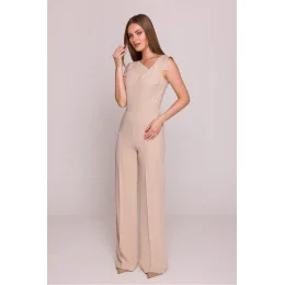 Moderní kombinéza vyrobená z hladké, lehce elastické látky s saténovým zpracováním, které jí dodává jemný lesk a eleganci. Model bez rukávů s asymetrickým výstřihem zdobený efektní přeháňkou, která přitahuje pozornost a zdůrazňuje jedinečný charakter oblečení. Zapínání na skrytý zip na zádech zaručuje pohodlí a udržuje čistý vzhled. Horní část kombinézy je přiléhavá, s vysokým pasem, což zdůrazňuje pas a dodává siluetě ženské tvary. Široké nohavice s přeloženým lemem přidávají styl a zajišťují pohodlí nošení. Boční kapsy jsou praktickým doplňkem a absence podšívky zajišťuje, že je kombinéza lehká a prodyšná. Navrženo a ušito v Polsku.