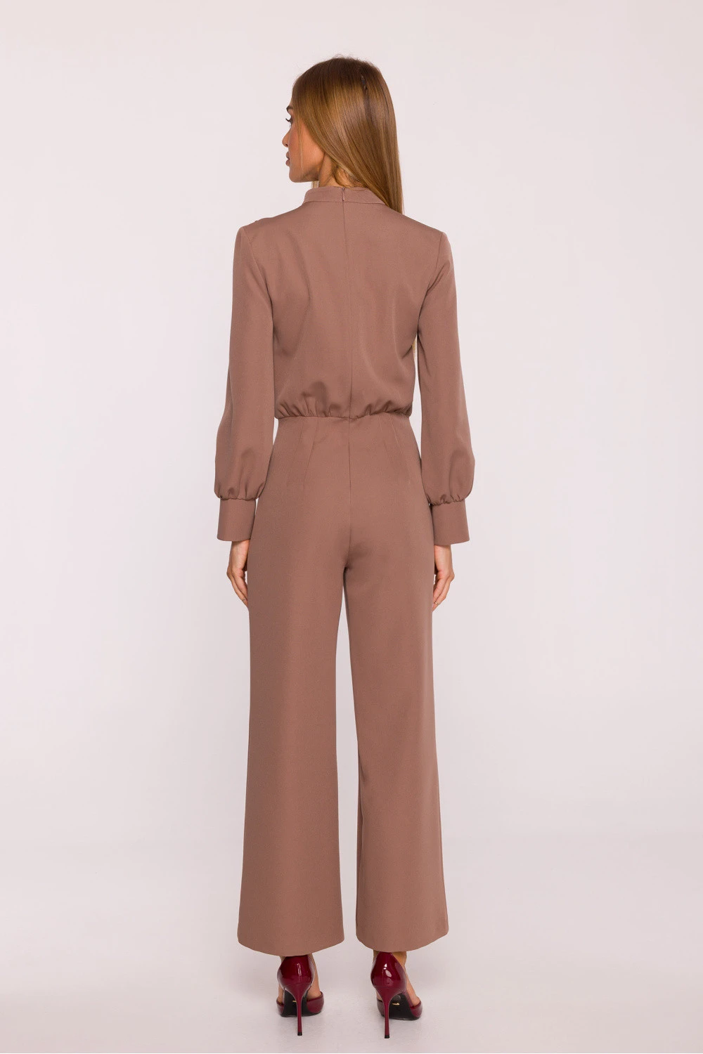 Elegantní kombinéza ušitá z hladké látky s matným povrchem je návrh, který spojuje moderní charakter s nadčasovou elegancí. Jednodílný střih krásně zdůrazňuje postavu, a přizpůsobený pas a široké nohavice 7/8 dodávají celku lehkost a volnost. Horní část kombinézy se vyznačuje stojáčkem s jemným rimplovaným efektem na rameni, který jemně modeluje linii ramen a dodává zvláštní eleganci. Dlouhé rukávy jsou ukončeny širokými manžetami se štěrbinou, zdůrazňující elegantní charakter projektu. Dekorativní knoflíky na rameni tvoří stylový detail, který dodává celku jedinečnost. Model se zapíná na skrytý zip vzadu, co zajišťuje pohodlné oblékání a estetické provedení. Bez podšívky a kapes zůstává kombinéza lehká, a hladká látka umožňuje vytváření mnoha různorodých stylizací, od každodenních po večerní. Navržený a ušitý v Polsku, vytvořený s ohledem na ženy, které oceňují eleganci, pohodlí a nadčasový design.
