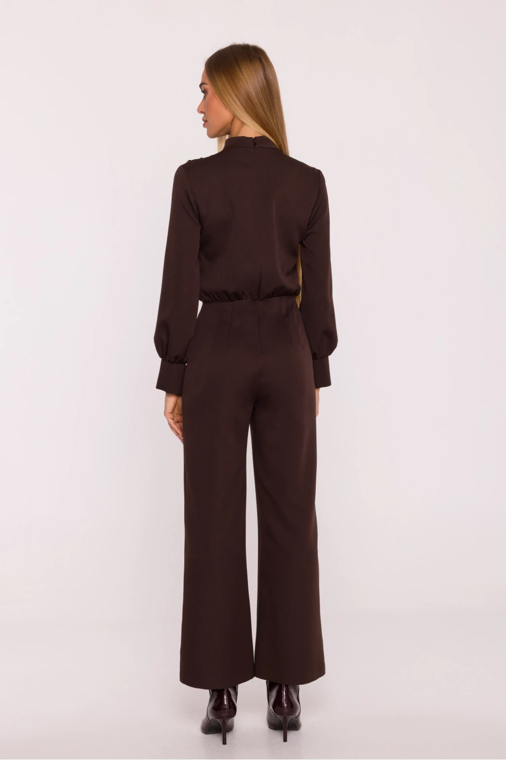 Elegantní kombinéza vyrobena z hladké látky s matným povrchem je návrh, který kombinuje moderní charakter s nadčasovou elegancí. Jednodílný tvar krásně zdůrazňuje postavu, a přizpůsobený pas a široké nohavice 7/8 dodávají celku lehkost a volnost. Horní část kombinézy se vyznačuje stojkou s jemným zdrapem na rameni, který jemně modeluje linii ramen a dodává zvláštní eleganci. Dlouhé rukávy jsou zakončeny širokými manžetami se štěrbinou, zdůrazňující elegantní charakter projektu. Ozdobné knoflíky na rameni jsou stylovým detail, který dodává celku nezaměnitelnost. Model se zapíná na skrytý zip na zádech, což zajišťuje pohodlné oblékání a estetické provedení. Chybějící podšívka a kapsy zajišťují, že kombinéza zůstává lehká, a hladká látka umožňuje vytváření mnoha různých stylizací, od každodenních po večerní. Navržen a vyroben v Polsku, vytvořen s ohledem na ženy, které ocení eleganci, pohodlí a nadčasový design.