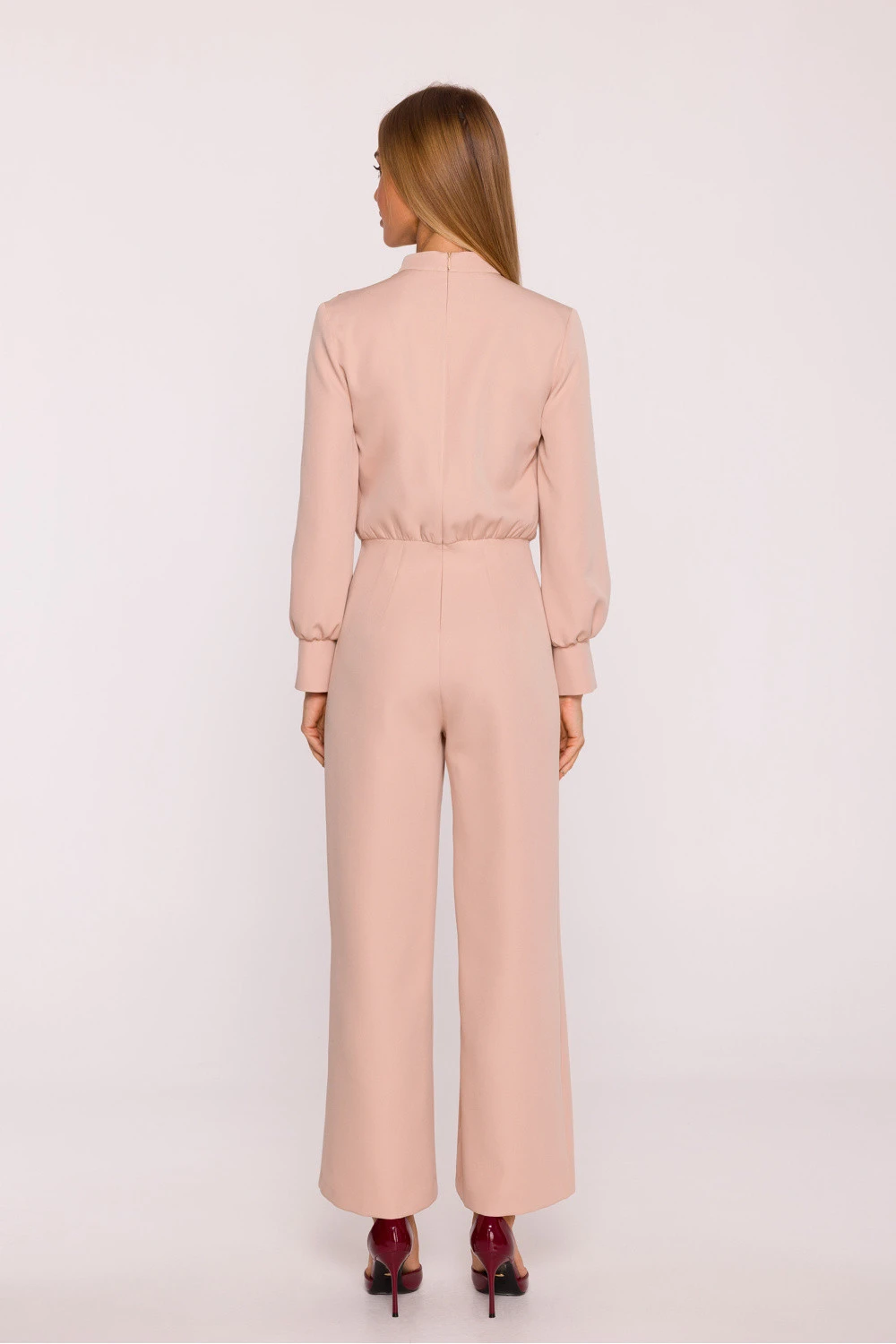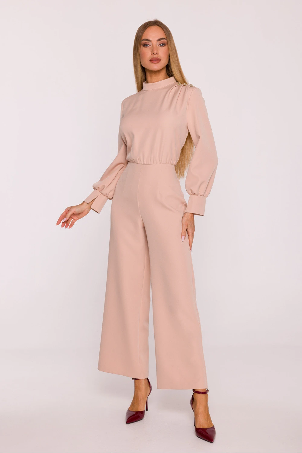 Elegantní kombinéza ušitá z hladké látky s matným povrchem je návrh, který spojuje moderní charakter s nadčasovou elegancí. Jednodílný střih krásně zdůrazňuje postavu, a přizpůsobený pas a široké nohavice 7/8 dodávají celku lehkost a volnost. Horní část kombinézy se vyznačuje stojkou s jemným záhybem na rameni, který jemně modeluje linii ramen a dodává výjimečný šarm. Dlouhé rukávy jsou zakončeny širokými manžetami se štěrbinou, zdůrazňující elegantní charakter projektu. Ozdobné knoflíčky na rameni jsou stylovým detail, který dodává celku jedinečnost. Model se zapíná na skrytý zip vzadu, co zajišťuje pohodlné oblékání a estetické dokončení. Bez podšívky a kapes kombinéza zůstává lehká, a hladká látka umožňuje vytvářet mnoho různých stylizací, od každodenních po večerní. Navržená a ušitá v Polsku, vytvořená s ohledem na ženy, které oceňují eleganci, pohodlí a nadčasový design.