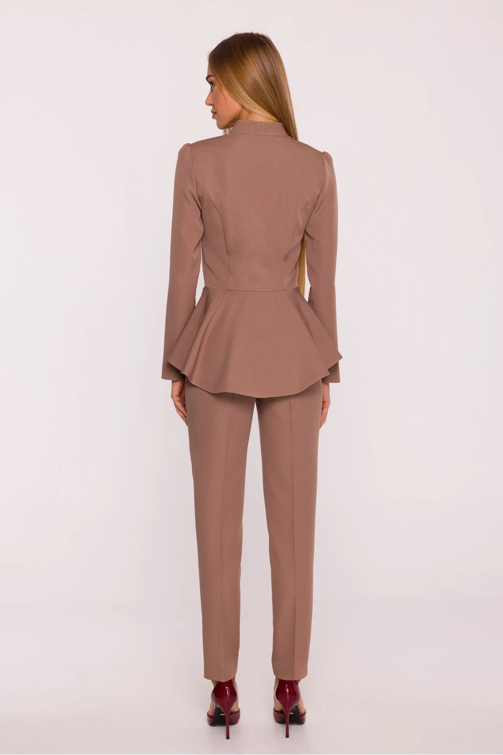 Elegantní kombinéza ušitá z hladké látky s matným povrchem je ideální kombinací moderního stylu a ženské formy. Jednodílný střih byl navržen tak, aby jemně modeloval postavu a zdůrazňoval její přednosti. Výstřih ve tvaru písmene V s možností upravení hloubky díky rozepínacímu zipu dodává celku smyslný charakter. Dlouhé rukávy přinášejí špetku elegance a skrytý zip vpředu zaručuje pohodlí a elegantní dojem. Pas je zdůrazněn řezem a efektním baskinkem, který zvýrazňuje pas a zakrývá boky, část hýždí a břicho, dodávající postavě harmonický tvar. Nohavice sežehou do délky kotníků, což opticky zúží nohy a dodá lehkost. Bez kapes a podšívky zůstává kombinéza lehká a pohodlná, zároveň si zachovává elegantní, rafinovaný vzhled. Navržena a ušita v Polsku, vytvořena pro ženy, které chtějí se cítit sebevědomě a výjimečně ve všech situacích.