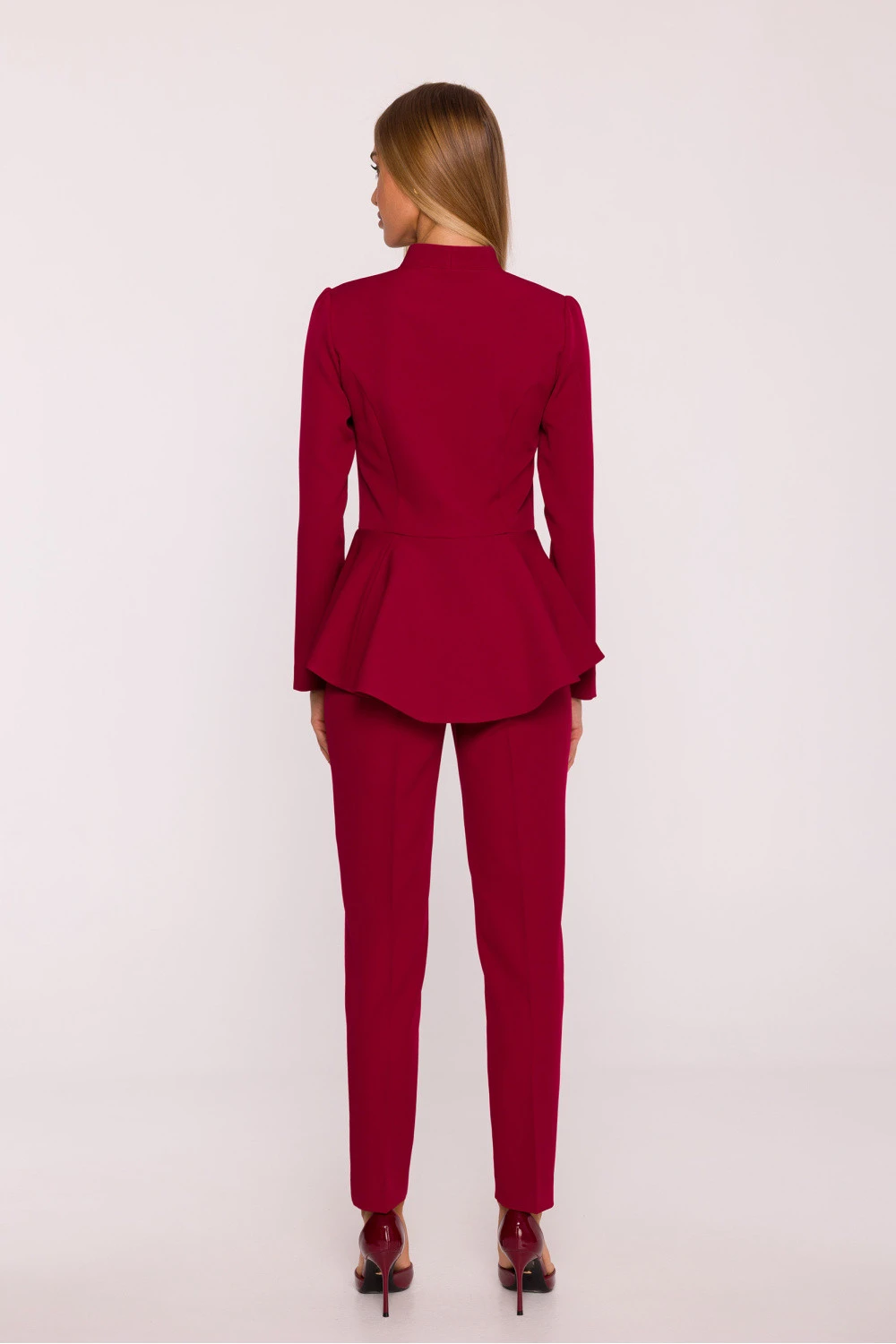 Elegantní kombinéza vyrobena z hladké látky s matným povrchem je ideální kombinací moderního stylu a ženské formy. Jednodílný střih byl navržen tak, aby jemně modeloval siluetu a zdůrazňoval její přednosti. Výstřih ve tvaru písmene V s možností regulace hloubky díky posuvnému zipu dodává celku smyslný charakter. Dlouhé rukávy přinášejí nádech elegance, a skrytý zip vpředu zaručuje pohodlí a elegantní dokončení. Pas byl zdůrazněn střihem a efektní baskinkou, která zdůrazňuje výřez a zakrývá boky, část hýždí a bříško, dodávající siluetě harmonický tvar. Nohavice po kotníky se zužují ke dnu, což opticky zjemňuje nohy a dodává lehkost. Chybějící kapsy a podšívka zajišťují, že kombinéza zůstává lehká a pohodlná, ale zároveň si uchovává elegantní, rafinovaný vzhled. Navržen a vyroben v Polsku, vytvořen s ohledem na ženy, které chtějí působit sebejistě a výjimečně v každé situaci.