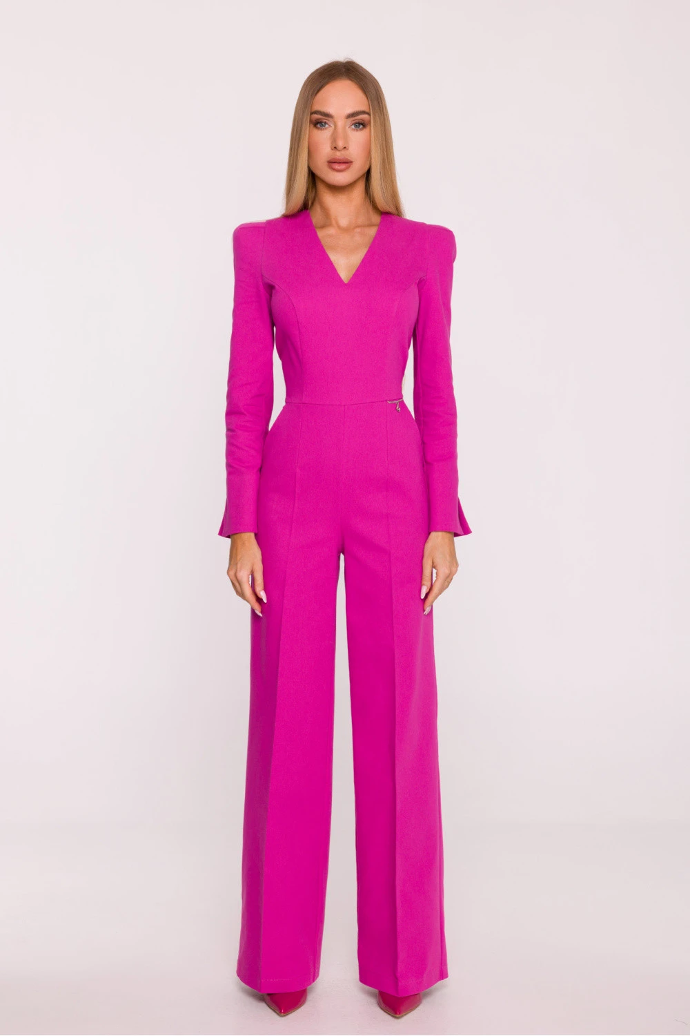 Elegantní kombinéza ušitá z látky imitující denim je jedinečnou nabídkou spojující moderní styl s klasickou formou. Mírně tuhá, matná a jemně elastická látka krásně drží střih, a podšívka zajišťuje pohodlí a bezchybné uspořádání celku. Model se vyznačuje výstřihem ve tvaru písmene V, který jemně zúží krk a dodává postavě lehkost. Dlouhé rukávy zakončené jemným rozšířením u manžety přinášejí elegantní, rafinovaný akcent. Zapínání na skrytý zip na zádech zajišťuje, že celkový dojem je souvislý a uklizený. Horní část kombinézy má jasně vyznačenou, strukturální linii ramen a přizpůsobený pas, který dále zdůrazňuje kovový řetízek s logem. Široké nohavice typu palazzo, sahající až na zem, opticky prodlužují postavu a dávají jí vyvážené, zúžené proporce. Navržený a ušitý v Polsku, vytvořený s ohledem na ženy, které oceňují moderní eleganci, pohodlí a dokonalé provedení v každém detailu.