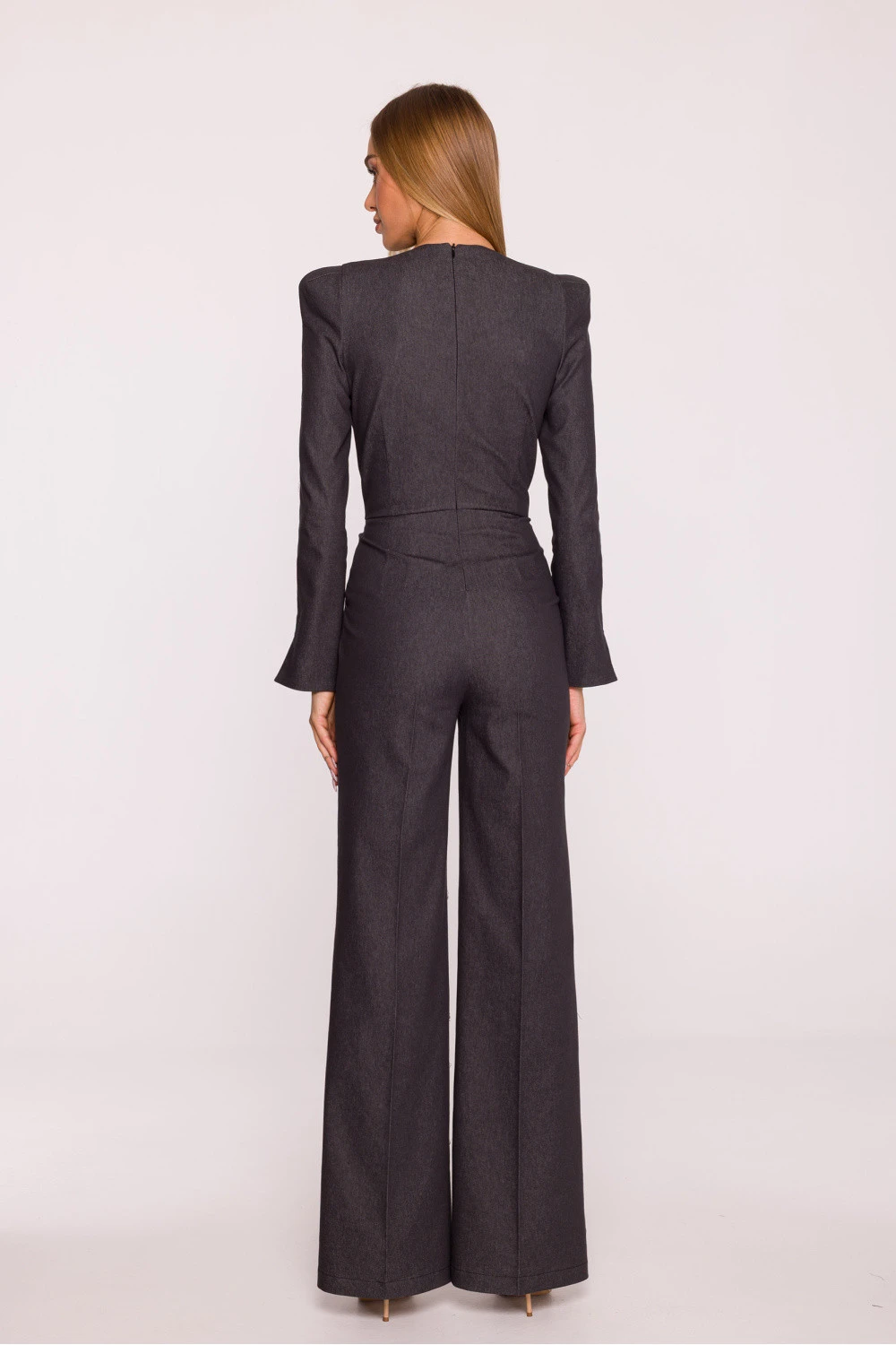 Elegantní kombinéza ušitá z látky imitující džínovinu je výjimečným návrhem spojujícím moderní styl s klasickou formou. Lehce tuhá, matná a jemně elastická látka krásně drží střih, a podšívka (95% polyester, 5% elastan) zajišťuje pohodlí a bezchybné uspořádání celku. Model se vyznačuje výstřihem ve tvaru písmene V, který jemně prodlužuje krk a dodává siluetě lehkost. Dlouhé rukávy zakončené jemným rozklokem u manžety přinášejí elegantní, rafinovaný akcent. Zapínání na skrytý zip vzadu dělá celkový dojem souvislý a pěkný. Horní část kombinézy má jasně vystínovanou, strukturální linii ramen a přizpůsobený pas, který dále zdůrazňuje kovový řetízek s logem. Široké nohavice typu palazzo, sahající až na zem, opticky prodlužují siluetu a dodávají jí vyvážené, prodloužené proporce. Navržený a ušitý v Polsku, vytvořený s ohledem na ženy, které ocení moderní eleganci, pohodlí a dokonalé zpracování v každém detailu.
