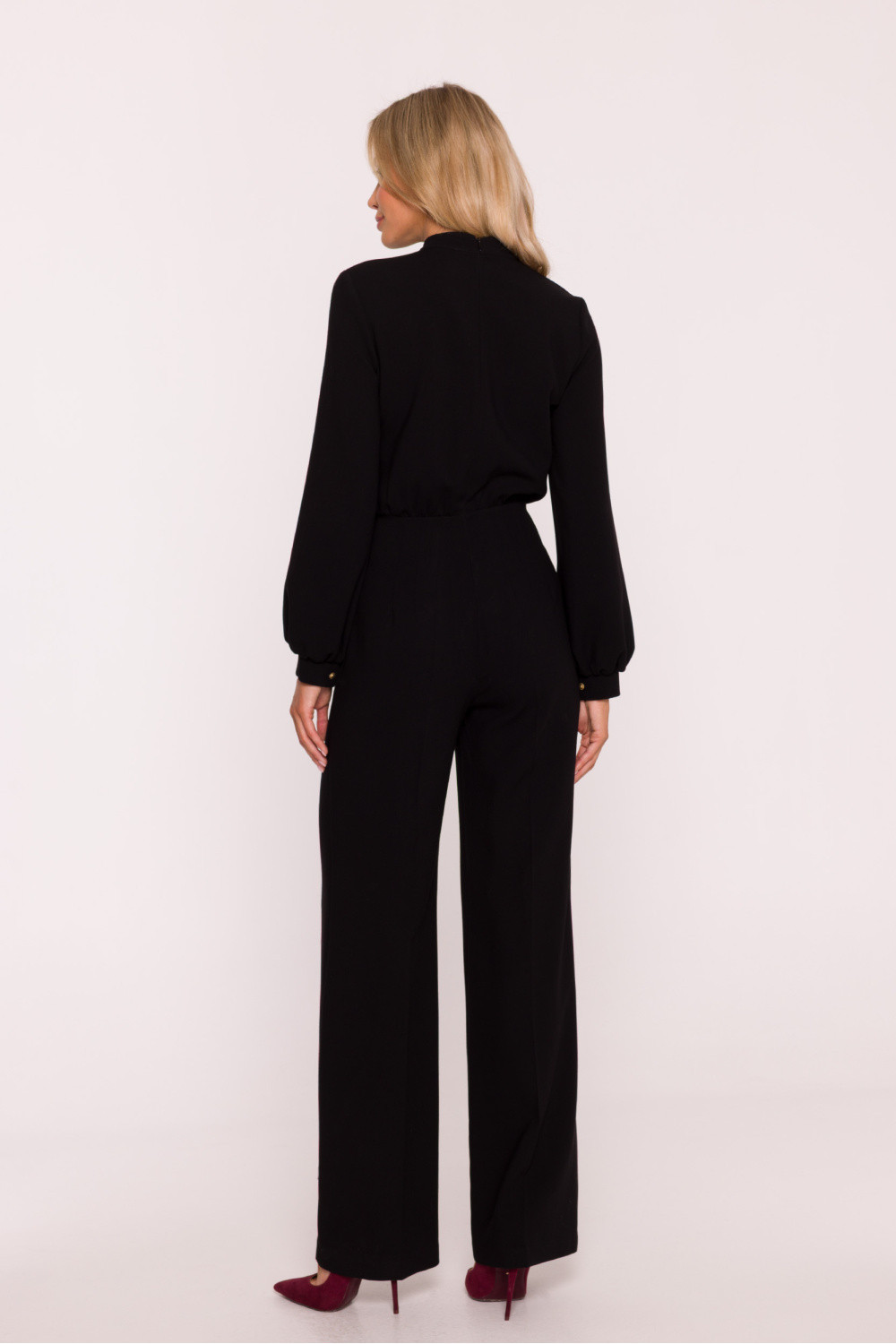 Elegantní, klasický overal vyrobený z hladké látky s jemným povrchem. Horní část je přiléhavá, zdobená decentním žabotem a zakončená stojáčkem kolem krku. Dlouhé, lehce objemné rukávy jsou zakončeny manžetami zapínajícími se na ozdobné knoflíčky, co dodává celku rafinovaný charakter. Pas je výrazně zdůrazněn, což podtrhuje postavu a harmonicky přechází do volnějších, přímých nohavic s oříznutým lemem. Na zádech skrytý zip zajišťuje pohodlné nošení a estetické zakončení. Model spojuje nadčasovou klasiku s moderním detaily, ideální jak na elegantní výstupy, tak formální události. Navrženo a ušito v Polsku.