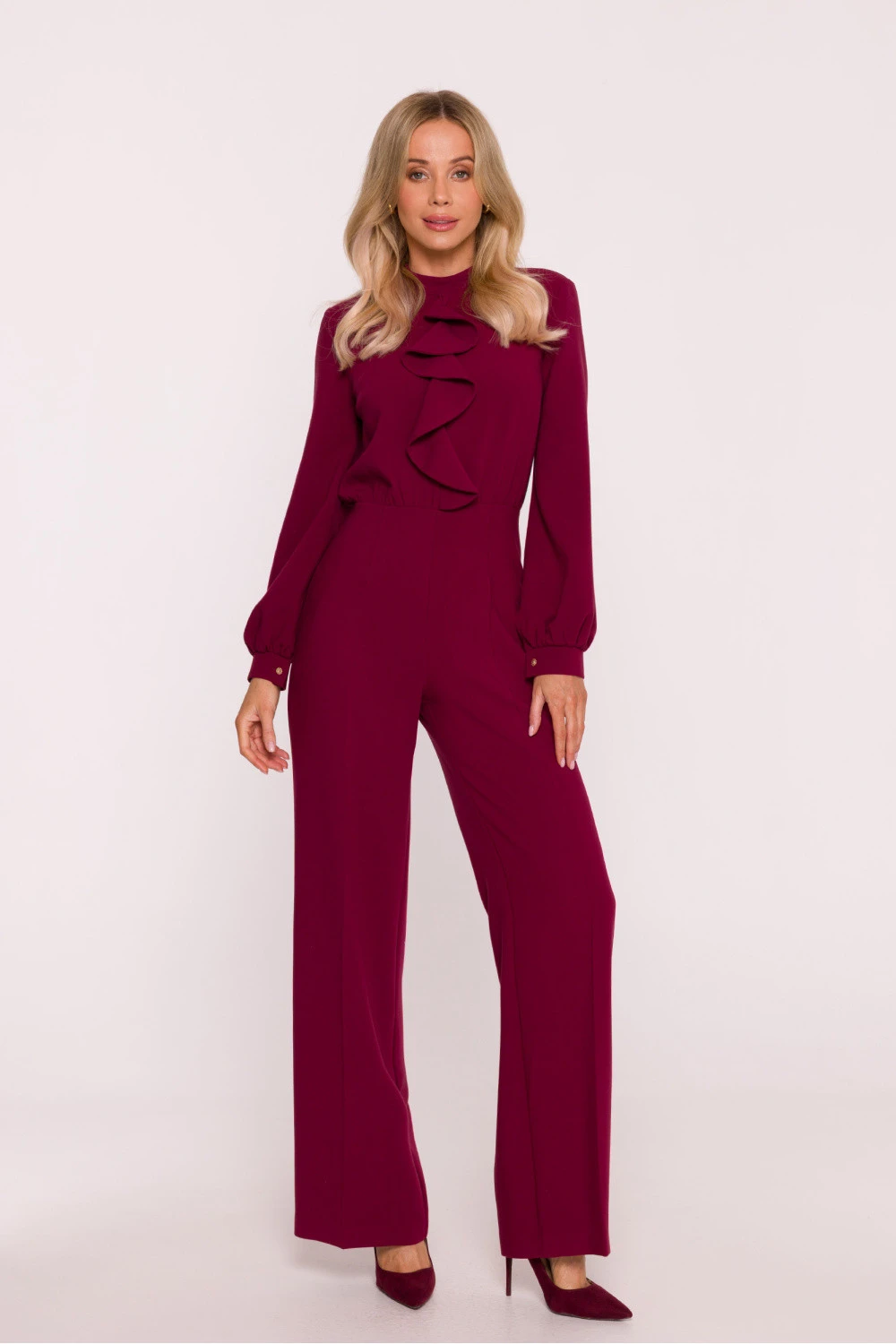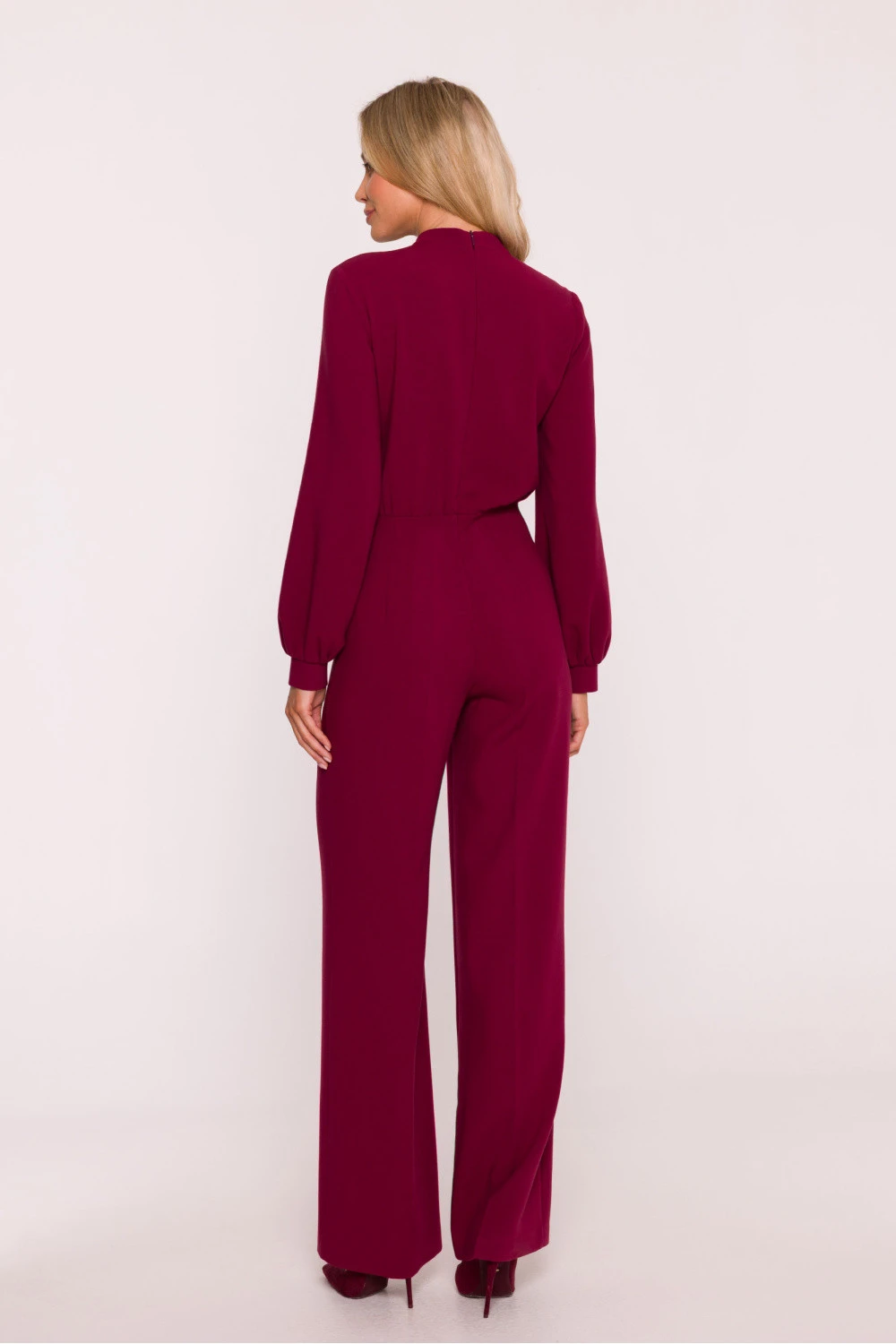 Elegantní, klasický overal vyrobený z hladké látky s jemným povrchem. Vrchní část je přizpůsobená, zdobená decentním záhybem a zakončená stojánkem kolem krku. Dlouhé, lehce objemné rukávy jsou zakončeny manžetami zapínajícími se na ozdobné knoflíčky, co dodává celku vysoce sofistikovaný charakter. Pas je jasně zdůrazněn, co zvýrazňuje siluetu a harmonicky přechází do volných, přímých nohavic s odklepávaným lemem. Na zádech skrytý zip zajišťuje pohodlné nošení a estetické dokončení. Model spojuje nadčasovou klasiku s moderním detailom, ideální jak na elegantní výstupy, tak na formální události. Navrženo a ušito v Polsku.