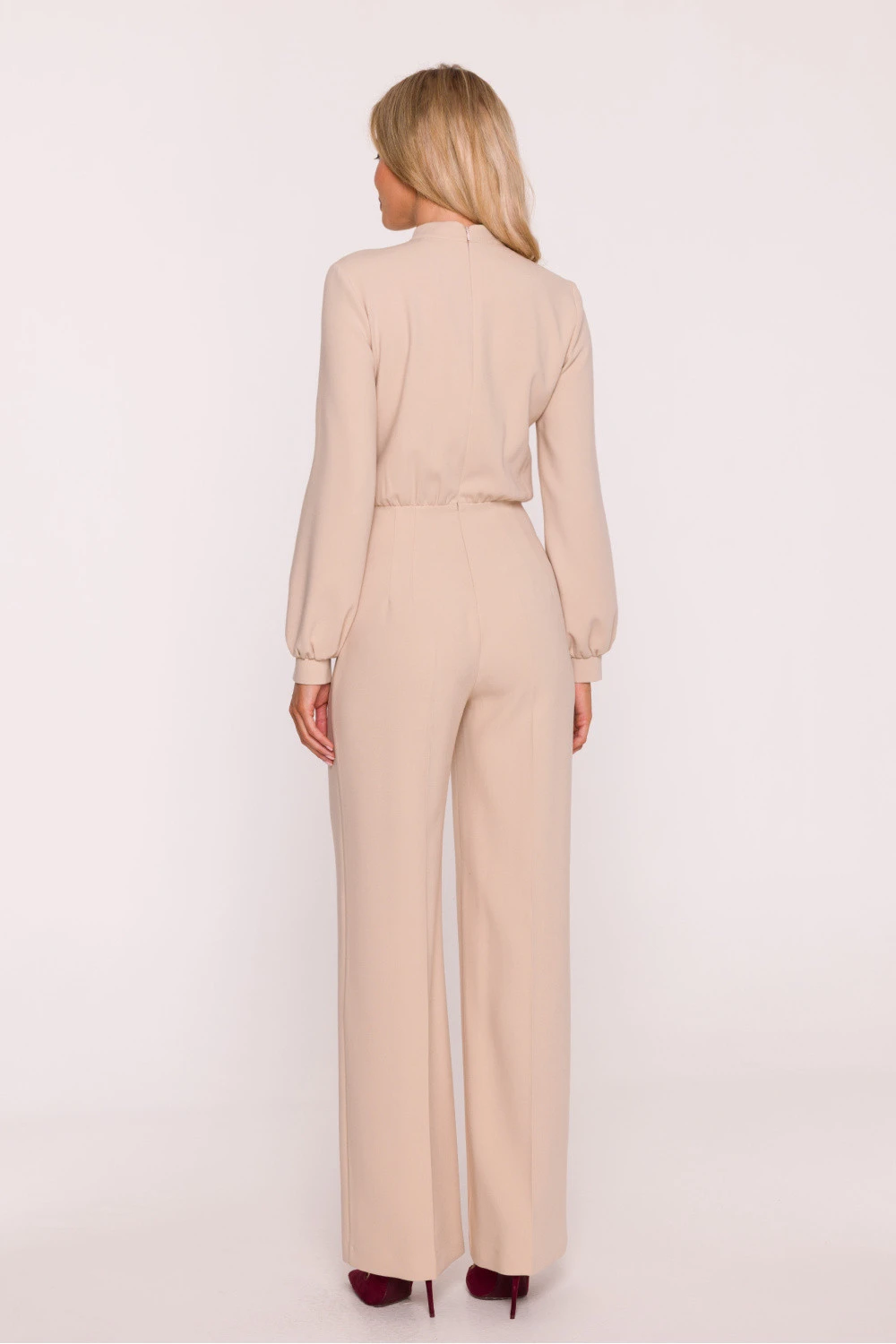 Elegantní, klasický overal vyrobený z hladké látky s jemným povrchem. Horní část je přiléhavá, zdobená jemným žabotem a ukončená stojáčkem kolem krku. Dlouhé, lehce objemné rukávy jsou zakončeny manžetami se zapínáním na ozdobné knoflíčky, co celkově přidává rafinovaný charakter. Pas je zřetelně zdůrazněn, což podtrhuje siluetu a harmonicky přechází do volnějších, přímých nohavic s opleteným lemem. Na zádech skrytý zip zajišťuje pohodlí nošení a estetické dokončení. Model spojuje nadčasovou klasiku s moderním detailen, ideální jak na elegantní výstupy, tak i formální příležitosti. Navrženo a ušito v Polsku.