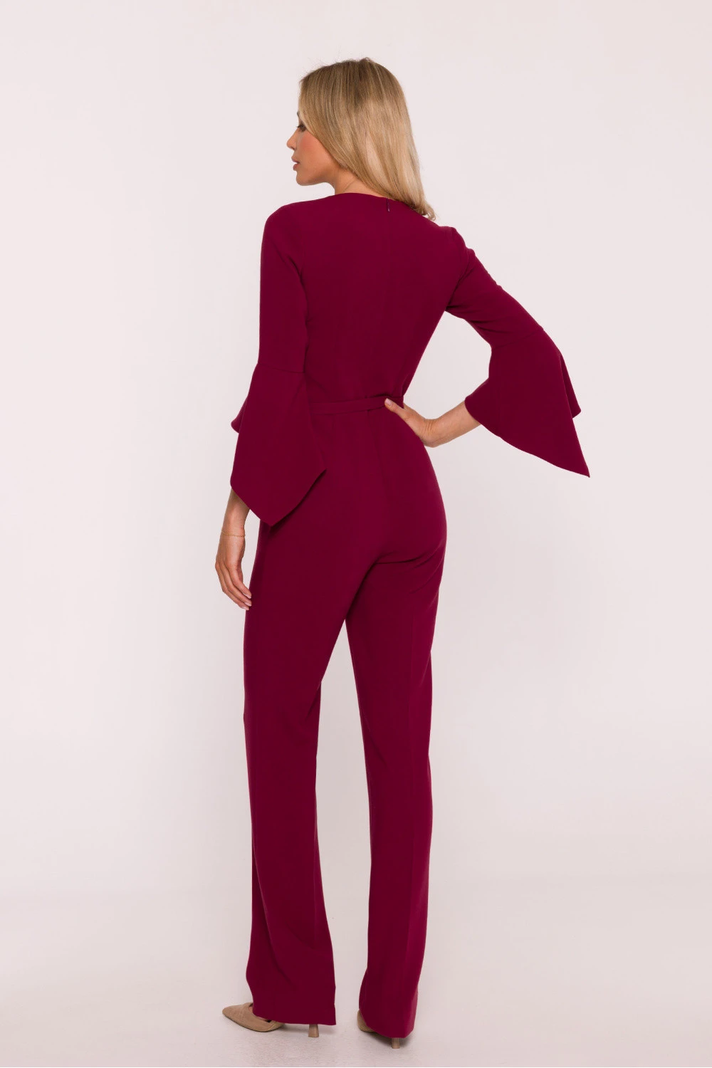 Dámský kombinéza vyrobený z hladké látky s jemným povrchem, kombinující eleganci s moderním detaily. Výstřih ve tvaru písmene V jemně zjemňuje siluetu, a rukávy délky 7/8 zakončené volánem dodávají celku lehkost a výjimečný charakter. Přizpůsobený vrch harmonicky ladí s přímými nohavicemi s ohrnutým lemem, vytvářející souvislou, elegantní linii. Pas byl zdůrazněn páskem s přezkou, který navíc zdůrazňuje ženskou siluetu. Model se zapíná na skrytý zip na zádech, bez kapes a podšívky, což ho činí lehkým a pohodlným na nošení. Ideální volba na elegantní večírky, obchodní schůzky a speciální příležitosti. Navrženo a ušito v Polsku.