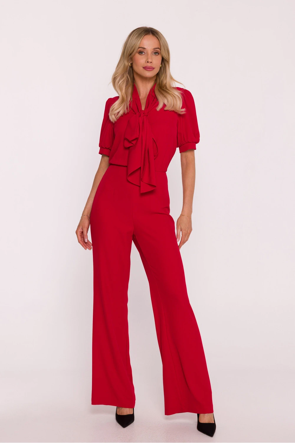 Elegantní dámský kombinéza je stylovou alternativou k šatům, ideální volbou na speciální události a elegantní výstupy. Vyrobený z hladké látky s lehkým leskem, působí velmi elegantně, zároveň zaručuje pohodlí při nošení. Model se vyznačuje ženským výstřihem ve tvaru písmene V, propojeným se stojkou přecházející do efektního vázání, které celku dodává jemnou finesu. Krátké, nadýchané rukávy jsou zakončeny manžetou s decentními záhyby, díky čemuž silueta získá lehkost a romantický charakter. Horní část má lehce zbluzovaný střih, a pas s vysokým pasem krásně zdůrazňuje postavu a opticky prodlužuje nohy. Nohavice jsou dlouhé, široké a lehce rozšířené ke dnu, což dává siluetě elegantní proporce a zajišťuje volnost pohybu. Celý outfit doplňuje skrytý zip vzadu, zaručující ideální přizpůsobení. Navrženo a ušito v Polsku s důrazem na detaily a nejvyšší kvalitu zpracování.
