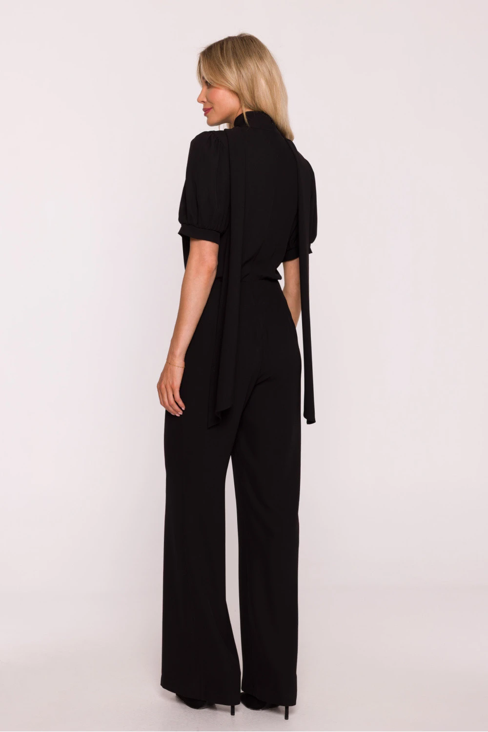 Elegantní dámský kombinéza je stylovou alternativou k šatům, ideální volbou na speciální události a elegantní výstupy. Vyrobený z hladké látky s lehkým leskem, působí velmi elegantně a zároveň zaručuje pohodlí nošení. Model se vyznačuje ženským výstřihem ve tvaru písmene V, spojeným se stojkou přecházející do efektního vázání, které celku dodává jemnou jemnost. Krátké, nafouklé rukávy jsou zakončeny manžetou s jemným mašlováním, díky čemuž silueta získá lehkost a romantický charakter. Horní část má lehce zbluzovaný střih a pas s vysokým sedem krásně zdůrazňuje postavu a opticky prodlužuje nohy. Nohavice jsou dlouhé, široké a lehce rozšířené ke spodu, což dodává siluetě elegantní proporce a zajišťuje volnost pohybu. Celkový vzhled doplňuje skrytý zip vzadu, zaručující ideální přizpůsobení. Navrženo a ušito v Polsku s důrazem na detaily a nejvyšší kvalitu zpracování.