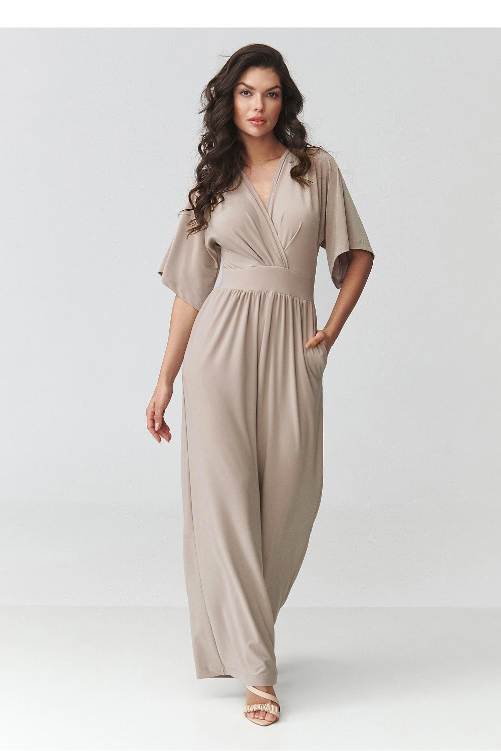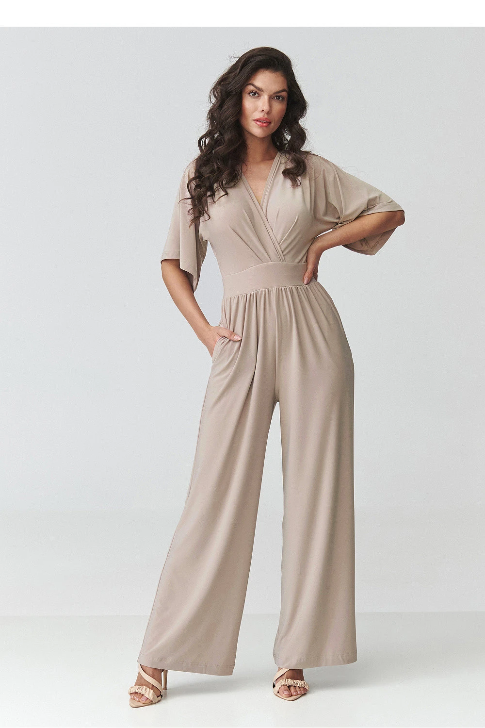 Elegantní dámský kombinéza je ideální volbou pro ženy, které ocení eleganci, pohodlí a nadčasový styl. Model se vyznačuje ženským střihem s přesahujícím výstřihem, který jemně zdůrazňuje postavu a dodává stylizaci lehkost a eleganci. Vyrovnávaný pas krásně tvaruje proporce těla a široké nohavice dodávají celku moderní charakter a zajišťují plnou volnost pohybu. Tento elegantní kombinéza na speciální příležitosti se skvěle hodí na večírky, rodinné oslavy, obchodní schůzky nebo večerní vycházky. Díky pečlivě navrženému střihu spojuje pohodlí nošení s módním vzhledem, což z něj činí skvělou alternativu klasickému šatům. Kratší rukávy zajistí pohodlí a praktické kapsy zvyšují funkčnost modelu.