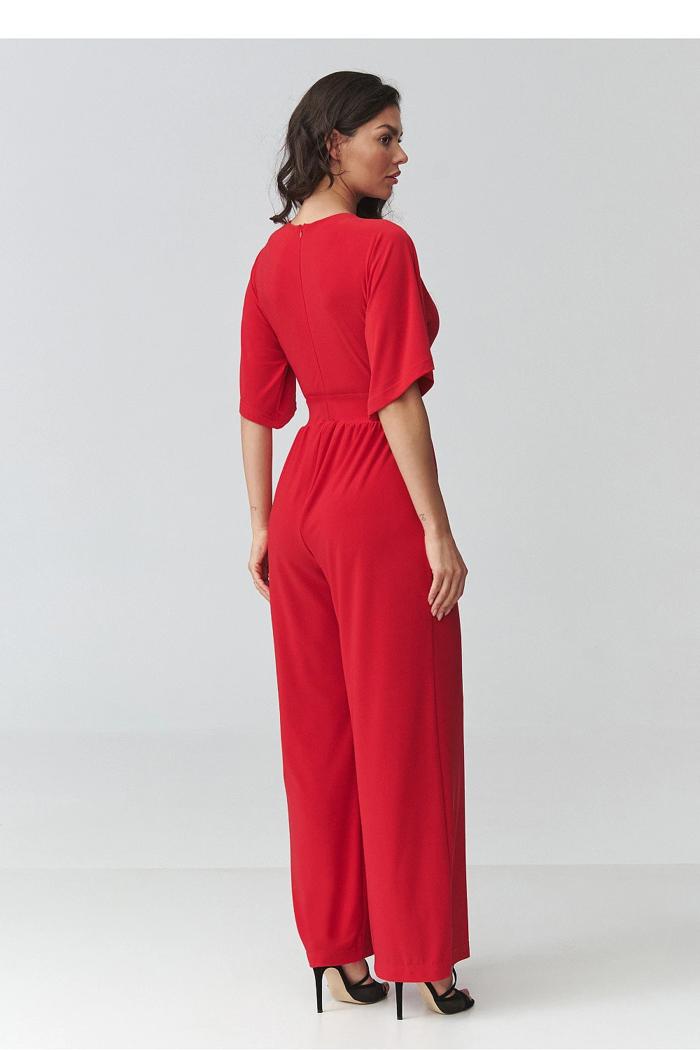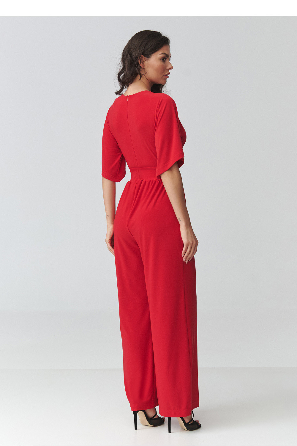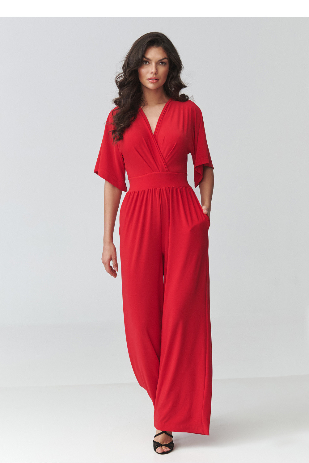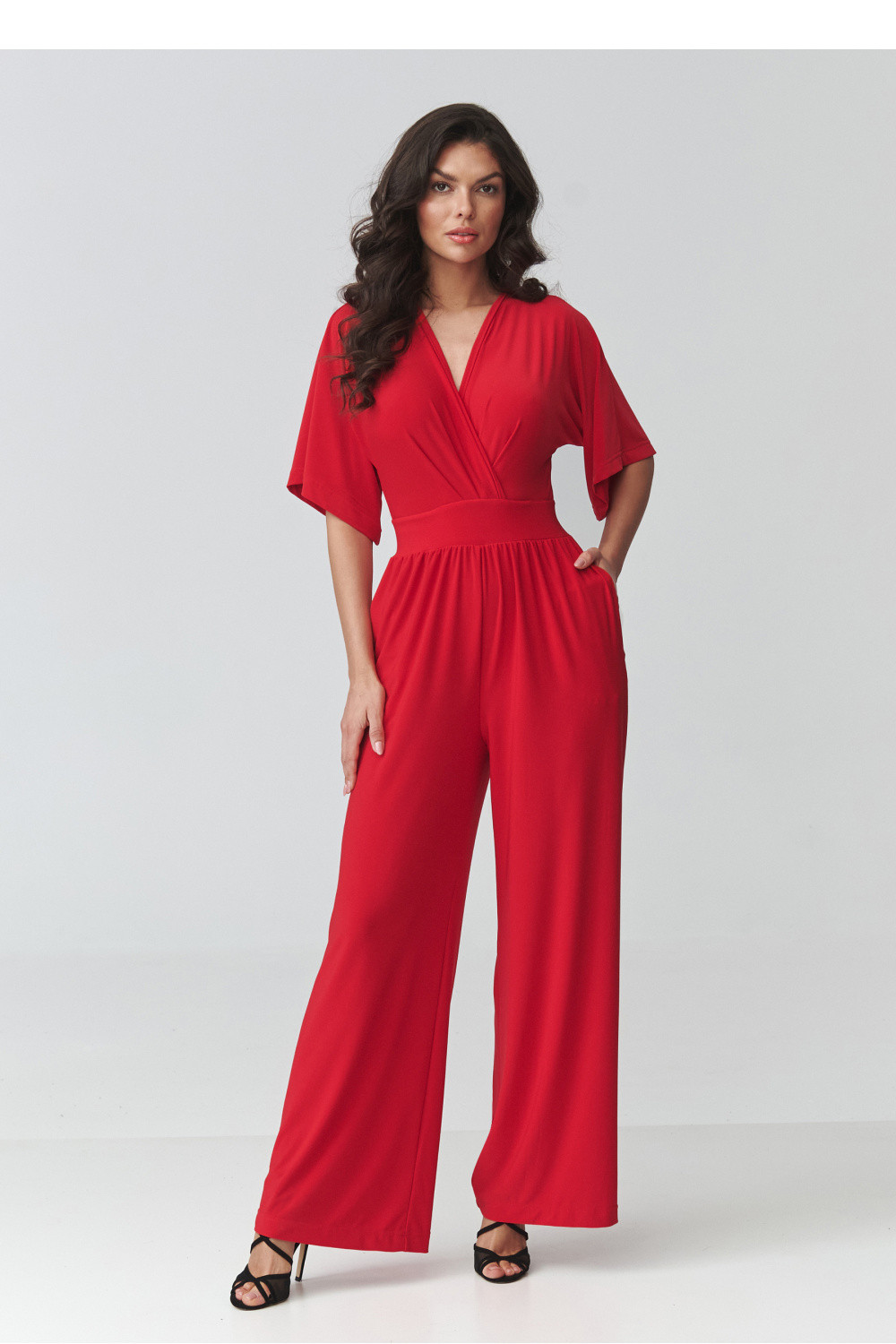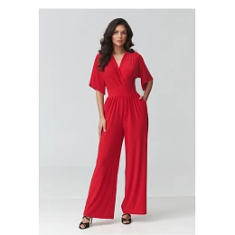Elegantní dámský kombinéza je ideální volbou pro ženy, které ocení eleganci, pohodlí a nadčasový styl. Model se vyznačuje ženským střihem s přesýpacím výstřihem, který jemně zdůrazňuje postavu a dodává stylizaci lehkost a eleganci. Přizpůsobený pas krásně tvaruje proporce těla, zatímco široké nohavice dodávají celku moderní charakter a zajišťují plnou volnost pohybu. Tento elegantní kombinéza na speciální příležitosti se skvěle hodí na večírky, rodinné slavnosti, obchodní schůzky nebo večerní vycházky. Díky pečlivě navrženému střihu spojuje pohodlí nošení s módním vzhledem, což z něj činí skvělou alternativu k klasické šaty. Kratší rukávy zajišťují pohodlí a praktické kapsy zvyšují funkčnost modelu.