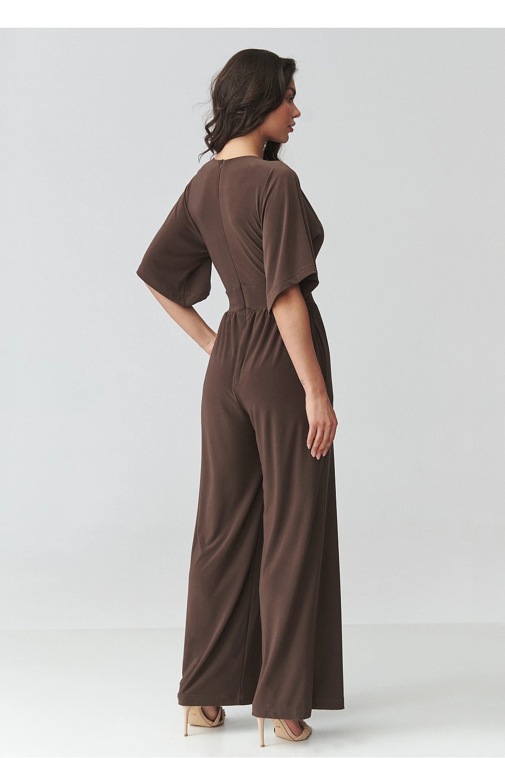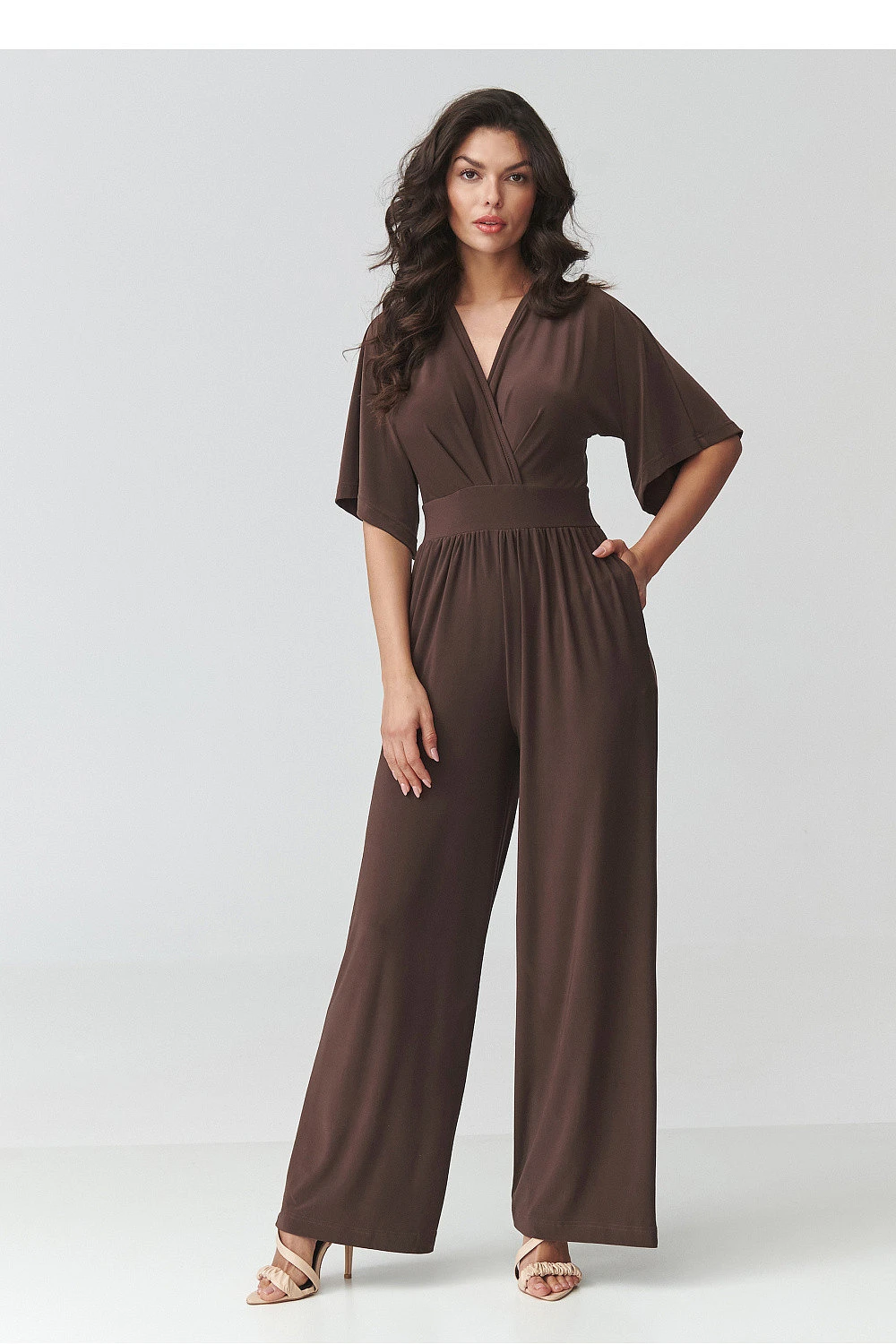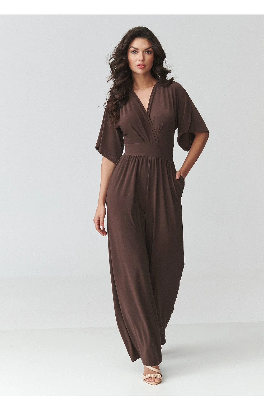 Elegantní dámský overal je ideálním návrhem pro ženy, které oceňují eleganci, pohodlí a nadčasový styl. Model se vyznačuje ženským střihem s přesýpacím výstřihem, který jemně zdůrazňuje postavu a dodává stylizaci lehkost a eleganci. Přizpůsobený pas krásně modeluje proporce těla, a široké nohavice dodávají celkovému vzhledu moderní charakter a zajišťují plnou volnost pohybu. Tento elegantní overal na speciální příležitosti se skvěle hodí na večírky, rodinné oslavy, obchodní schůzky nebo večerní vycházky. Díky pečlivě navrženému střihu spojuje pohodlí nošení s módním vzhledem, což z něj činí skvělou alternativu klasických šatů. Kratší rukávy zajistí pohodlí a praktické kapsy zvyšují funkčnost modelu.