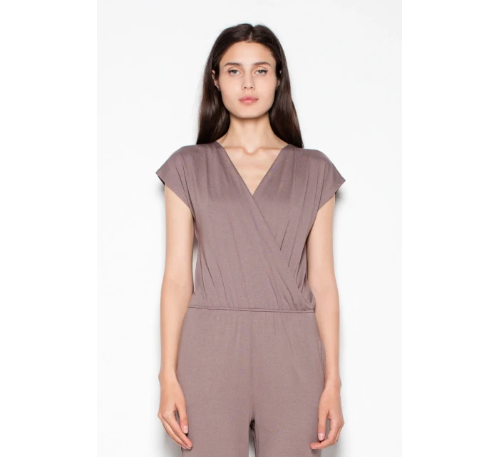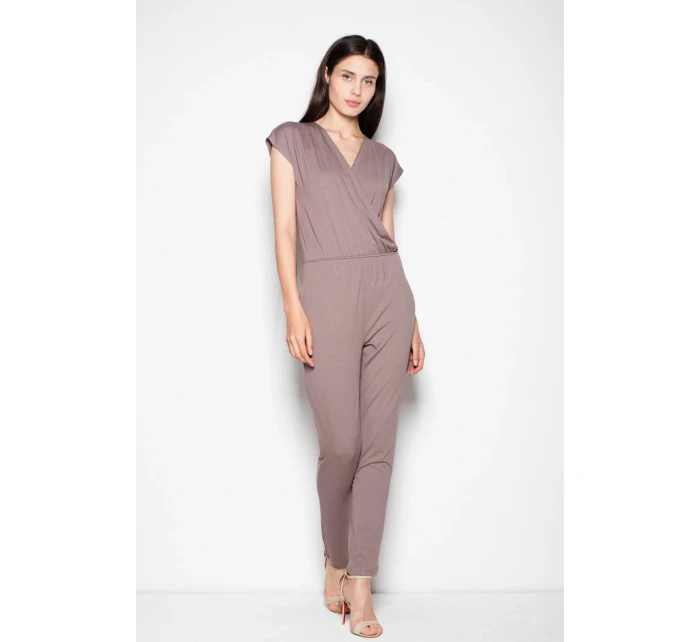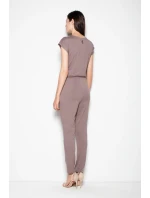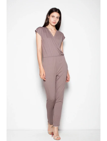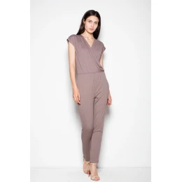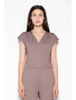 Sportovní kombinéza s krátkými rukávy a dlouhými zúženými nohavicemi. Model je zakončen efektním obálkovým výstřihem a šňůrkou v pase zdůrazňující siluetu.
