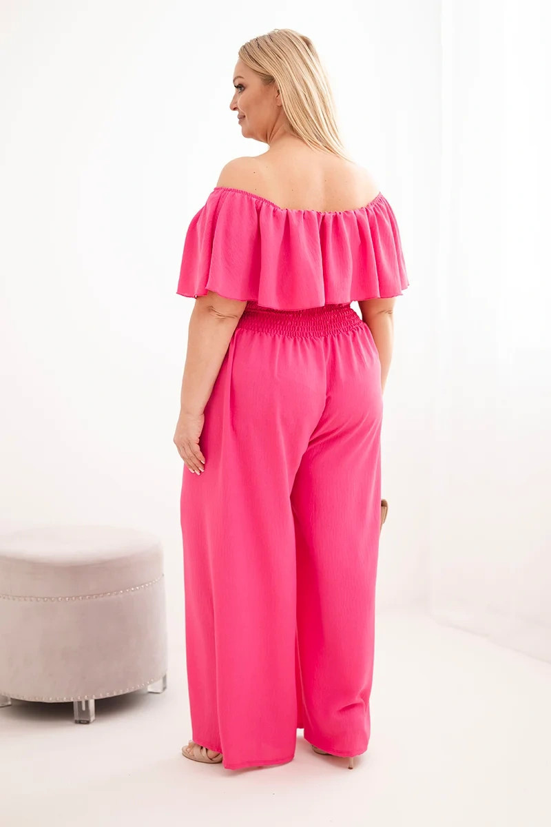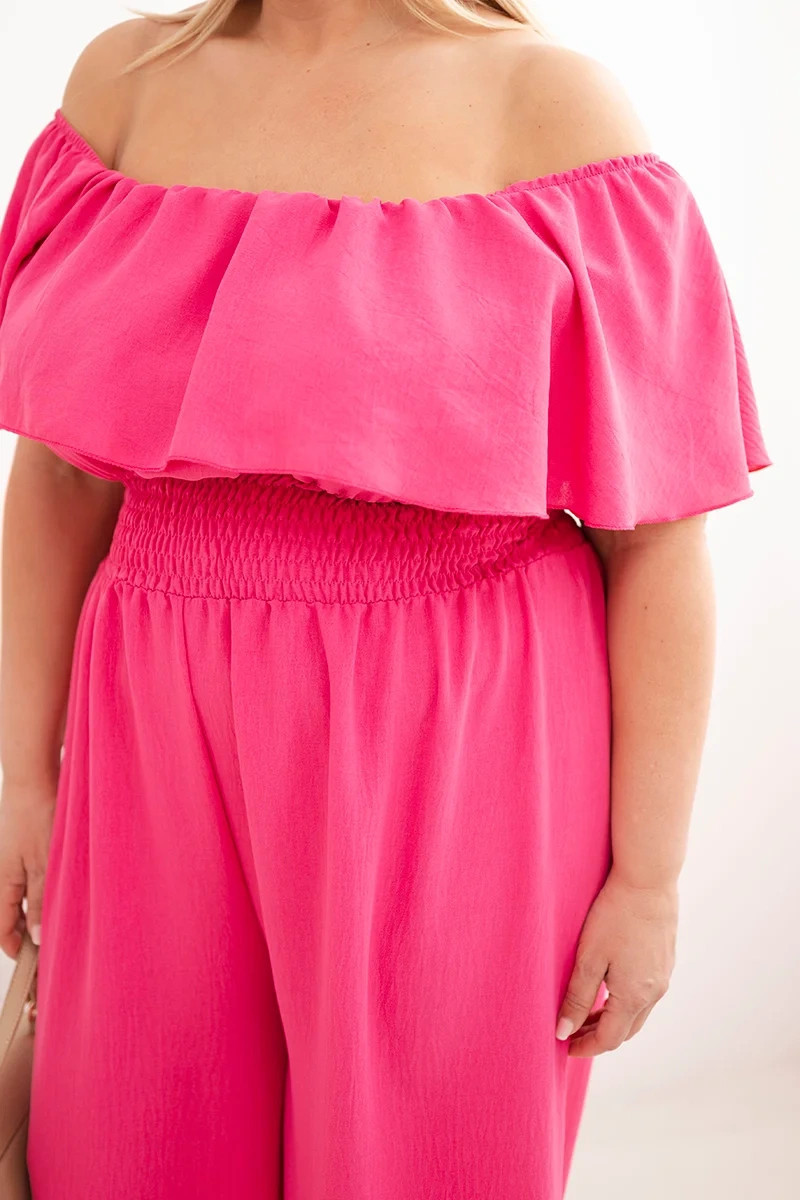 Dámský overal plus size s odhalenými rameny, volánem a širokými nohavicemi růžový