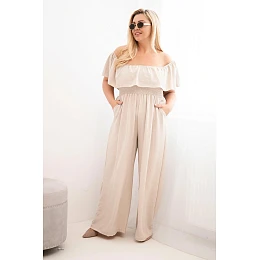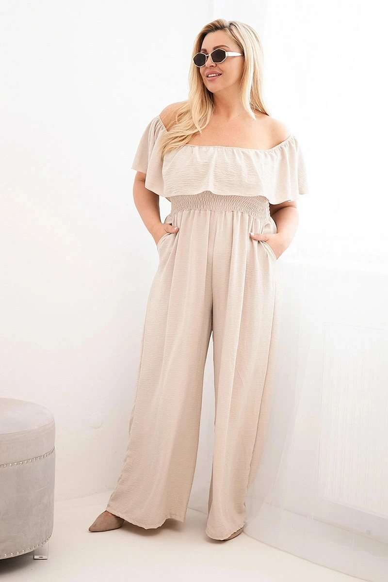 Dámský overal Plus Size s volánem a krátkým rukávem béžový