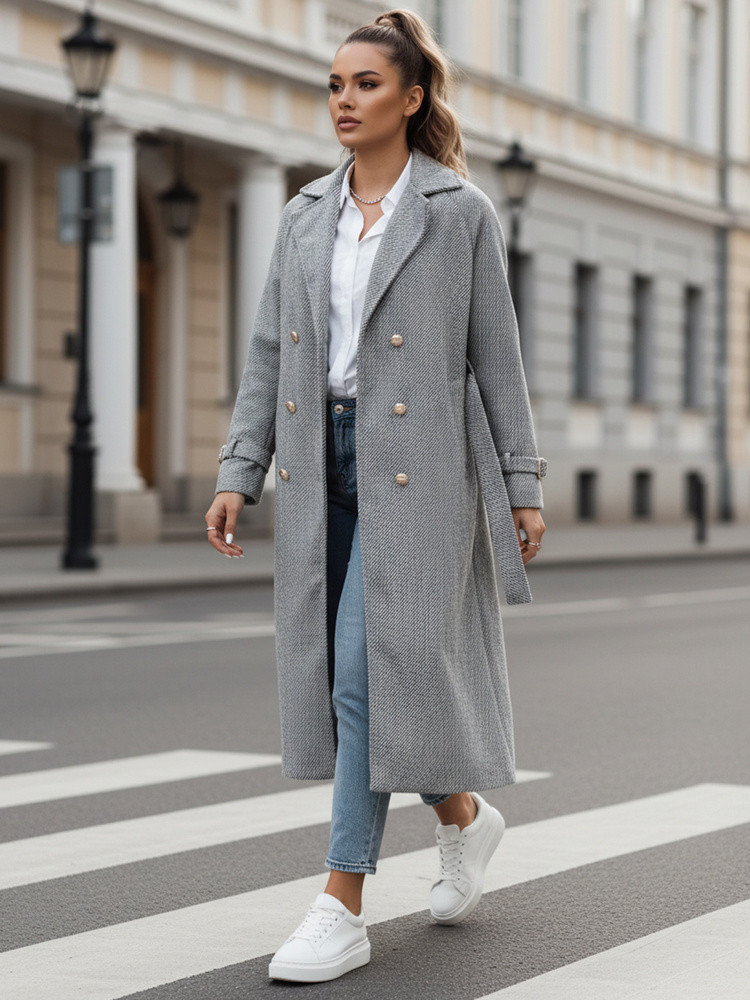 Dwurzędowy płaszcz damski o klasycznej linii został zaprojektowany z myślą o funkcjonalnym uzupełnieniu garderoby na sezon przejściowy. Tkanina o wyraźnej strukturze nadaje całości uporządkowany wygląd i dobrze układa się na sylwetce. Pasek w talii umożliwia regulację dopasowania i podkreślenie proporcji. Konstrukcja sprawdza się w codziennym użytkowaniu oraz w bardziej formalnych zestawieniach.