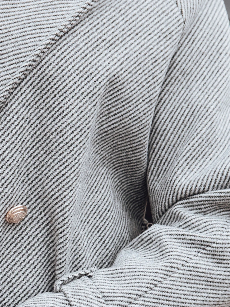 Dwurzędowe zapięcie stabilizuje formę płaszcza i pozwala na lepsze dopasowanie do sylwetki.