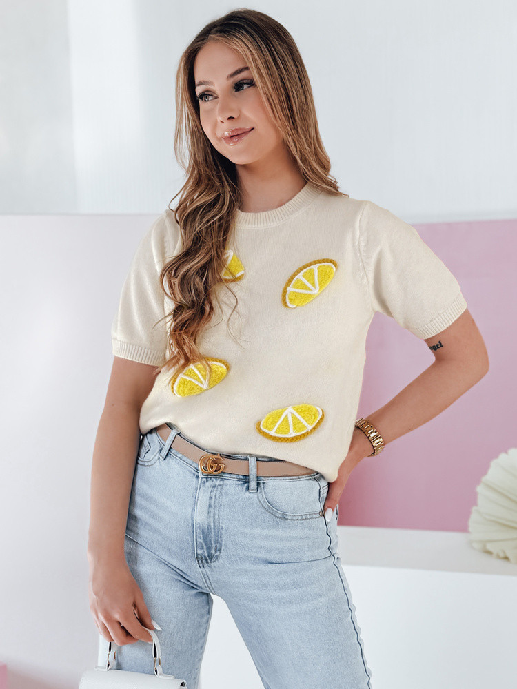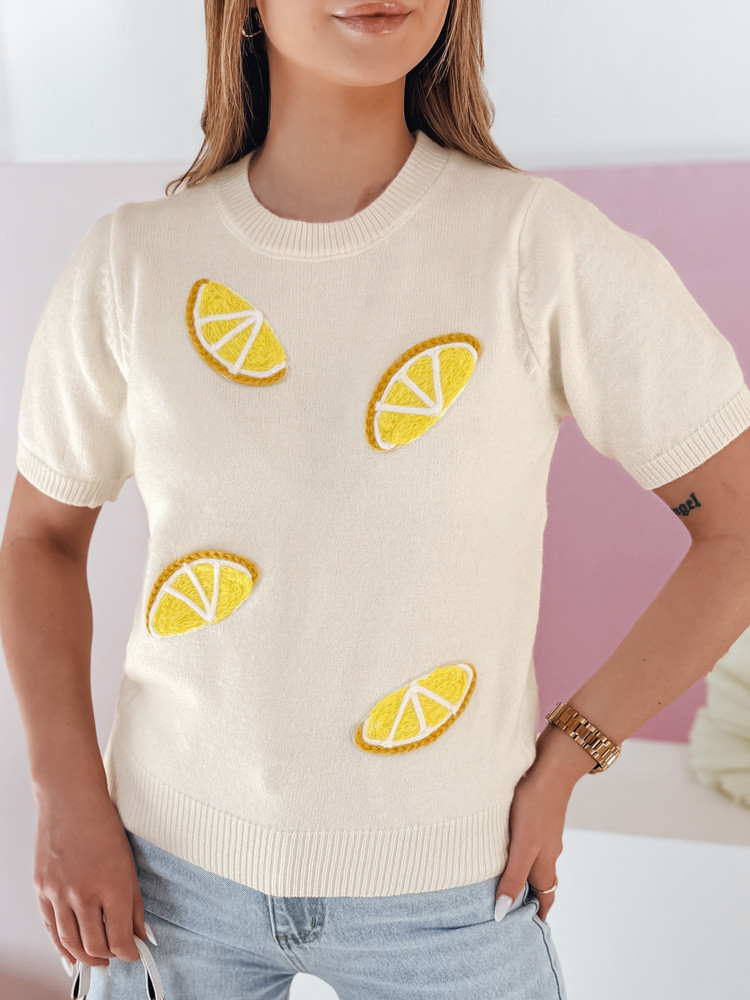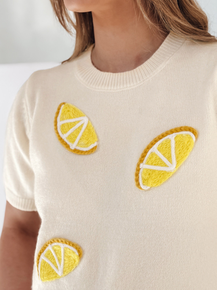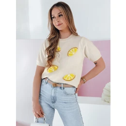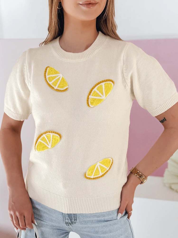 Sweter damski o kroju oversize z krótkim rękawem to idealna propozycja na wiosenne dni. Wykonany z miękkiego, przyjemnego dla skóry materiału, zapewnia komfort noszenia. Model wkładany przez głowę posiada okrągły dekolt oraz ściągacze przy rękawach i dole, które nadają całości schludnego wykończenia. Uniwersalny rozmiar pasuje od XS do L. Ozdobne aplikacje w kształcie cytryn przyciągają wzrok oraz nadają świeżego, radosnego charakteru stylizacjom. Sweter świetnie łączy się z jeansami lub szortami, tworząc stylowy look na cieplejsze dni.