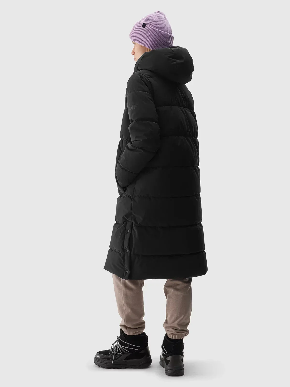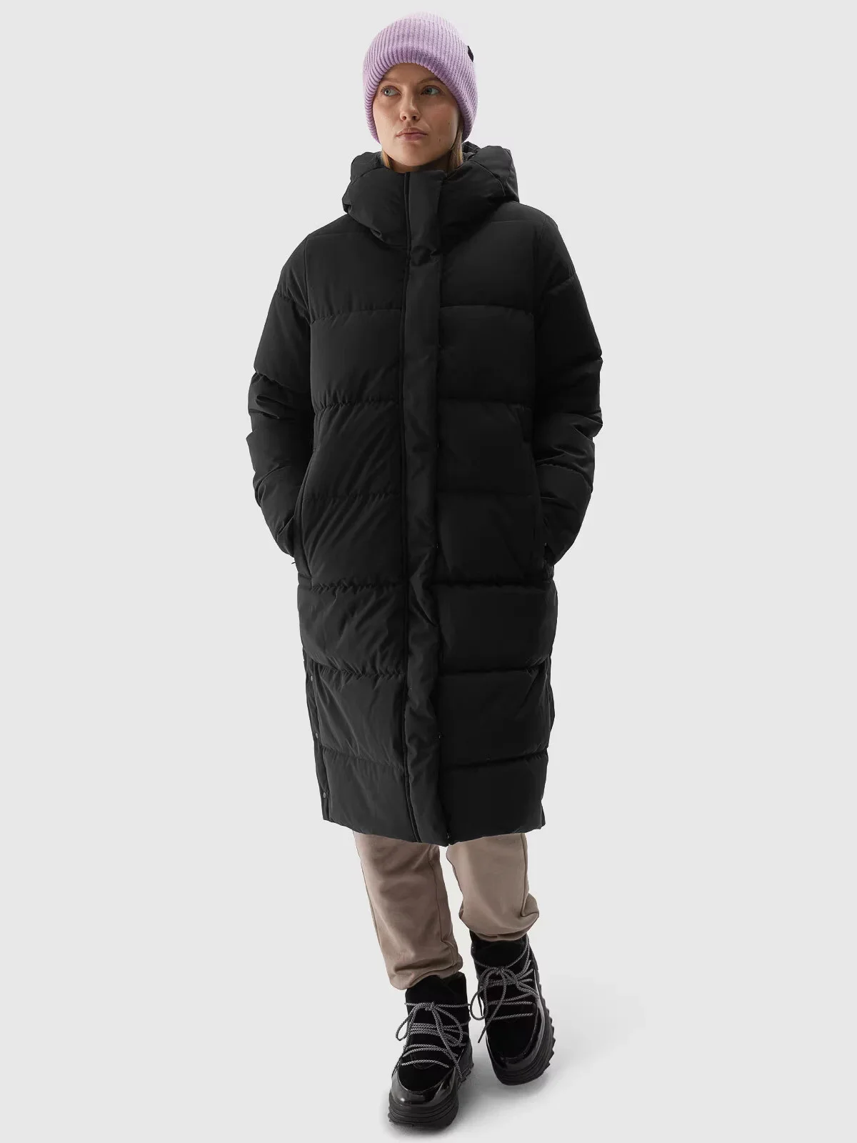 Má střih regular, který se pohodlně přizpůsobí postavě, a délku sahající pod kolena pro větší ochranu před chladem.