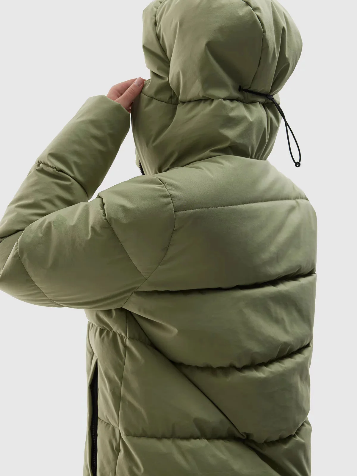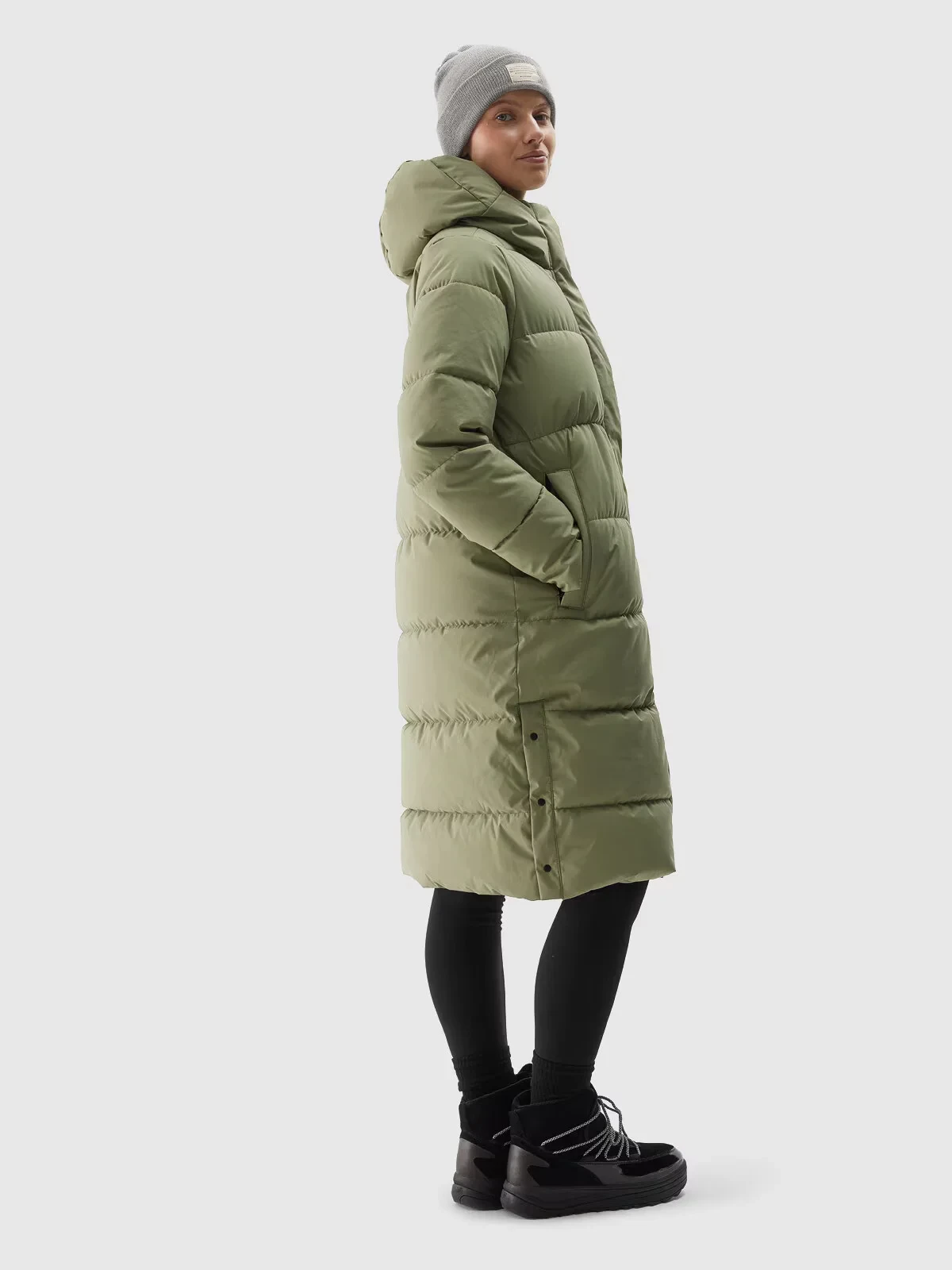 Má střih regular, který se pohodlně přizpůsobí postavě, a délku sahající pod kolena pro větší ochranu před chladem.