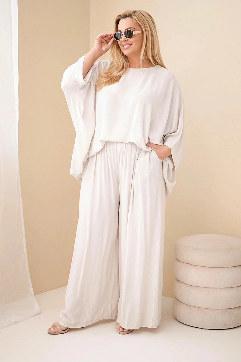 Dámský plus size viskózový komplet se širokými kalhotami a halenkou béžový