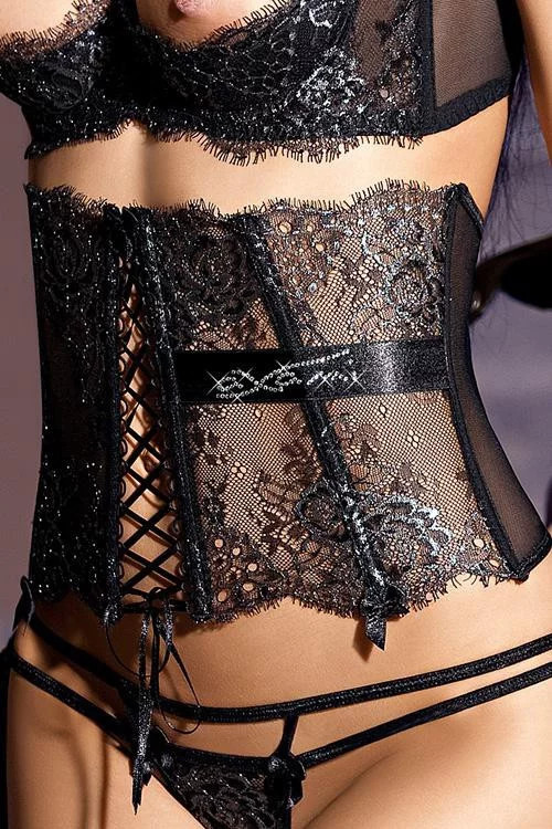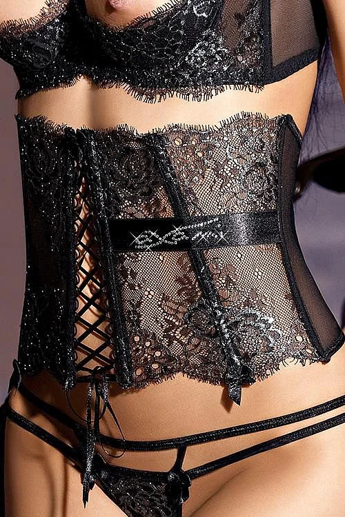 Luxusní a elegantní polokorzet Axami V-3002 Carmen zdůrazňující pas. Korzet se zapíná vzadu na háčky. Svítící krystaly Swarovski doplňují jemnou, černou krajku se stříbrnou nitkou. Lze kombinovat do soupravy s podprsenkou Axami V-3001 Carmen, tangami Axami V-3008 Carmen a oční páskou Axami V-3003 Carmen. Kolekce 2011 Corazones el Deseo.
