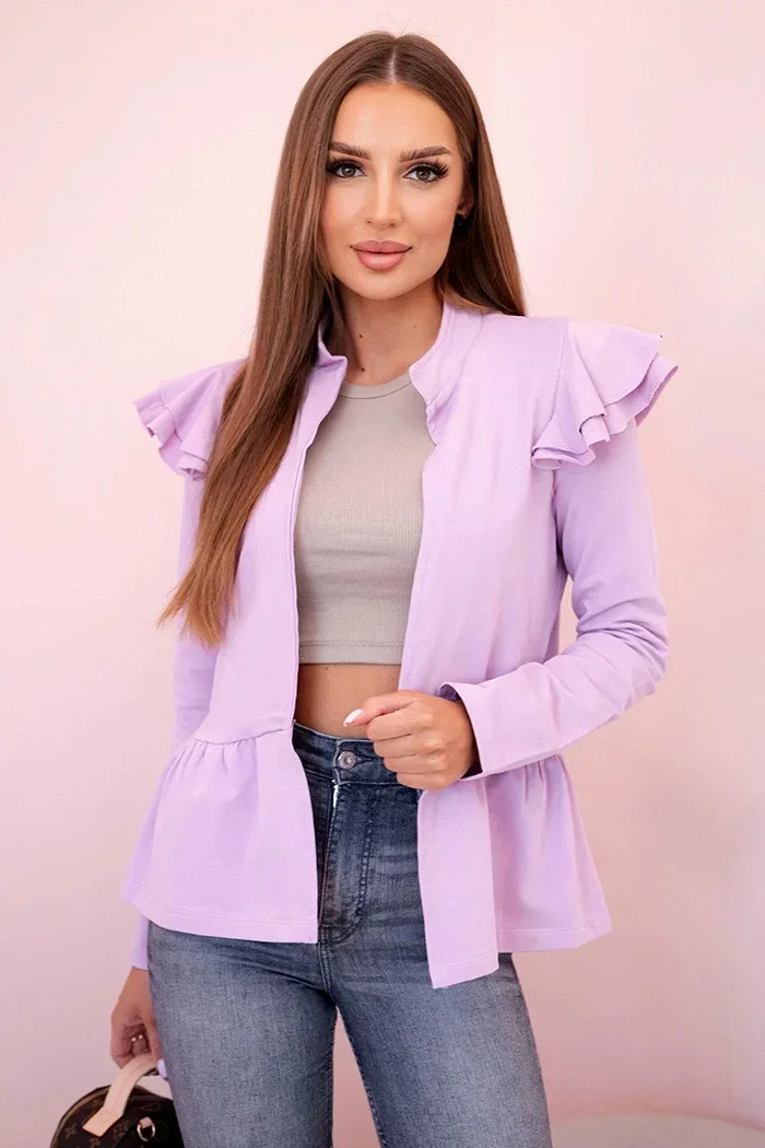 Stylová dámská přehozka s volánky je skvělou volbou pro ženy, které si cení pohodlí a elegance v každodenním stylu. Její výjimečný střih se stojáčkem a ozdobnými volánky na ramenou působí velmi ženským a módním dojmem. Model nemá zapínání, což jí dodává lehkost a umožňuje ji nosit jak volně, tak i staženou páskem podle vlastního vkusu. Vyrobena z měkké, elastické bavlny s příměsí elastanu zajišťuje pohodlí po celý den. Skvěle se hodí jako doplněk outfitu do práce, na univerzitu, setkání s přáteli nebo rodinný výlet. Velikost je univerzální a vhodná pro ženy ve velikostech S, M nebo L.