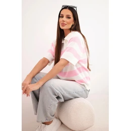 Stylový a mimořádně pohodlný dámský pruhovaný svetr je skvělým návrhem na jarní a letní dny. Vyroben z měkkého materiálu, zajišťuje pohodlí po celý den. Krátký rukáv a klasický polo límec mu dodávají elegantní, ale uvolněný vzhled. Jemné, pastelové pruhy přidávají lehkost a ženské kouzlo. Tento model se skvěle hodí jak na každodenní nošení, tak do více ležérních stylizací – do práce, na procházku nebo setkání s kamarádkou.