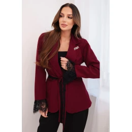Dámský sako s páskem a krajkovým model 21774839 rukávů bordová - K-Fashion