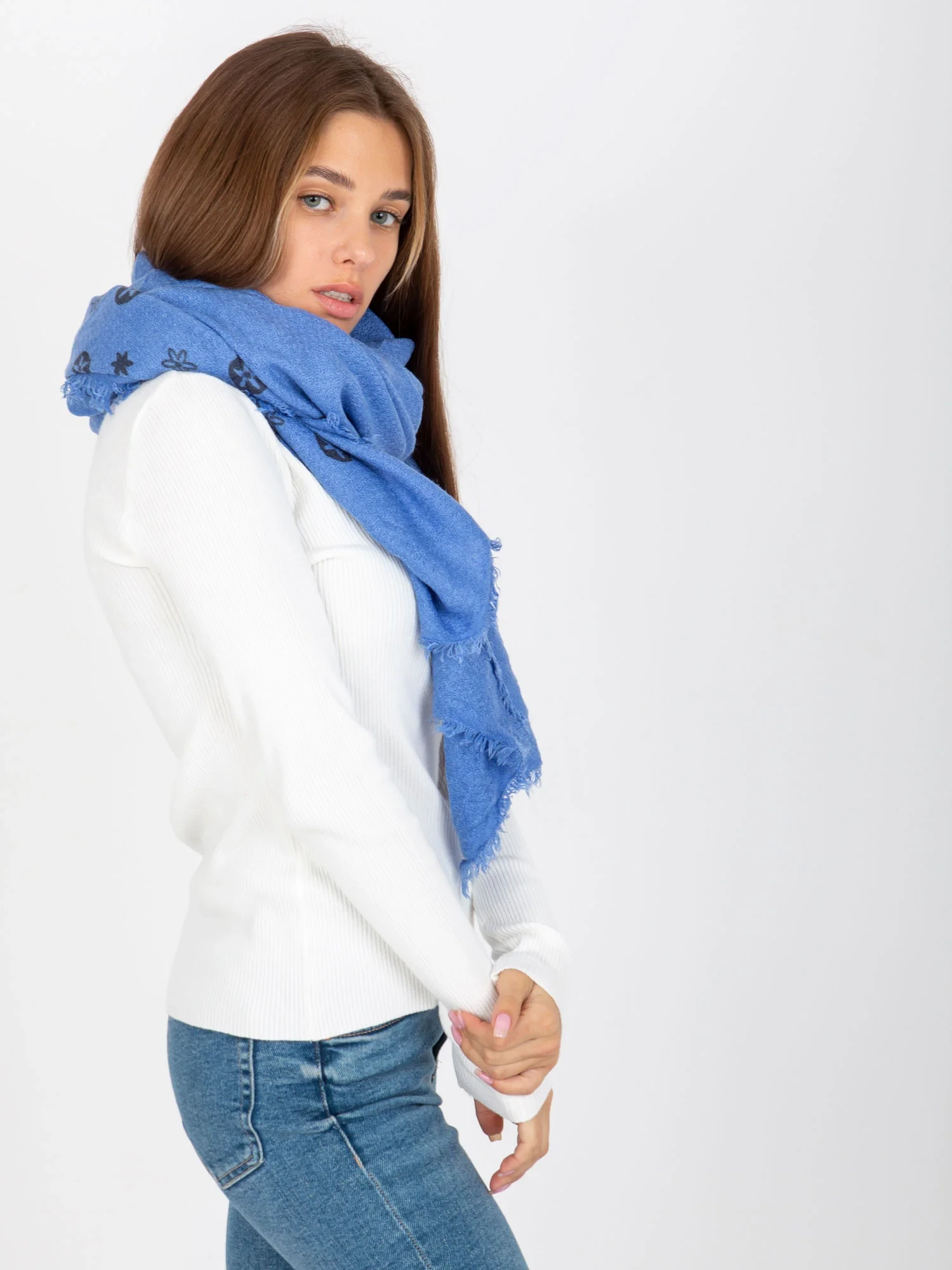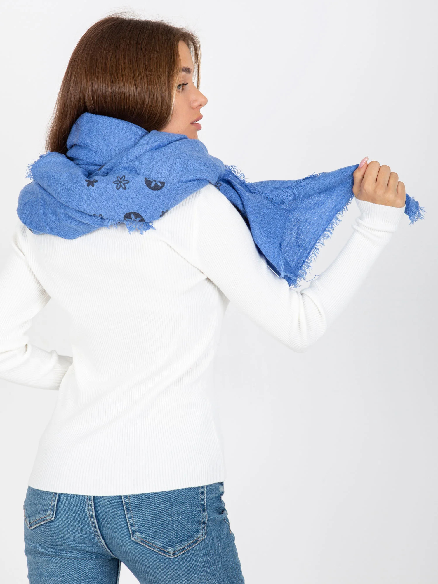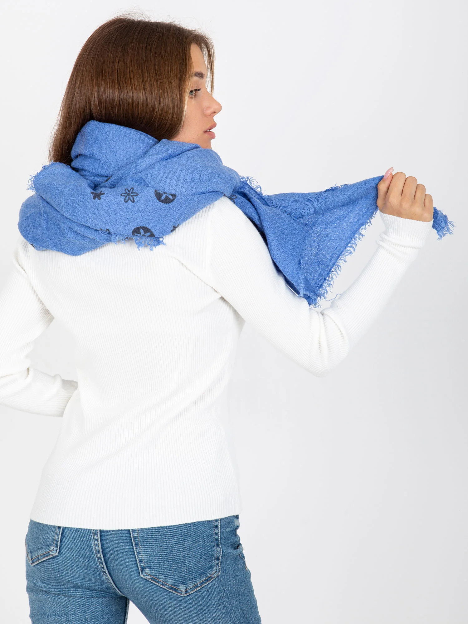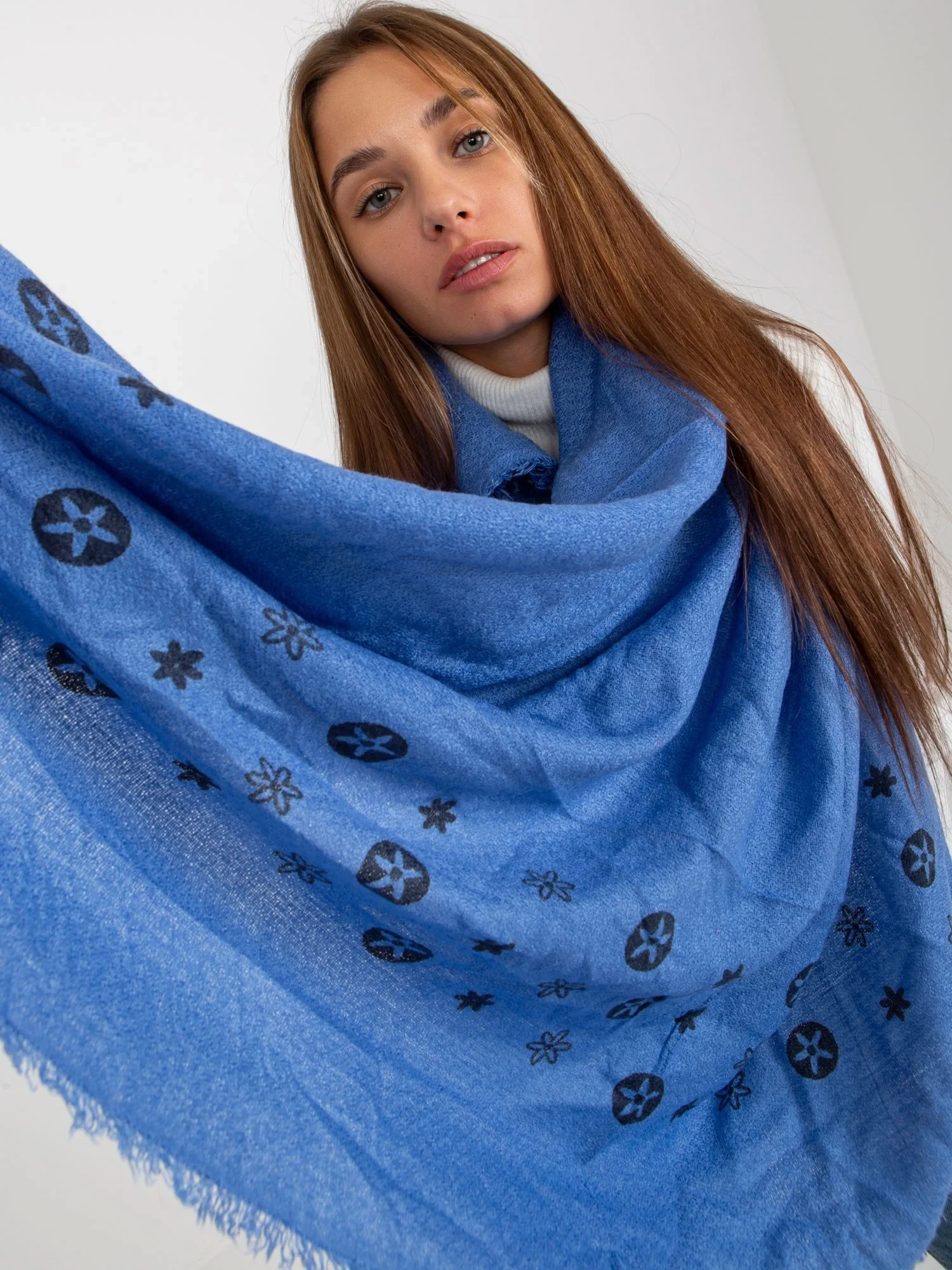 Modrý dámský šátek s potiskem .